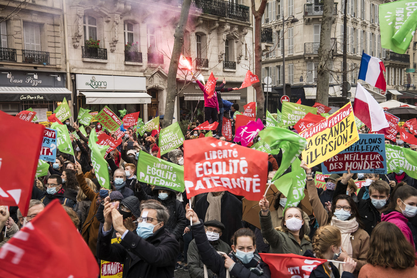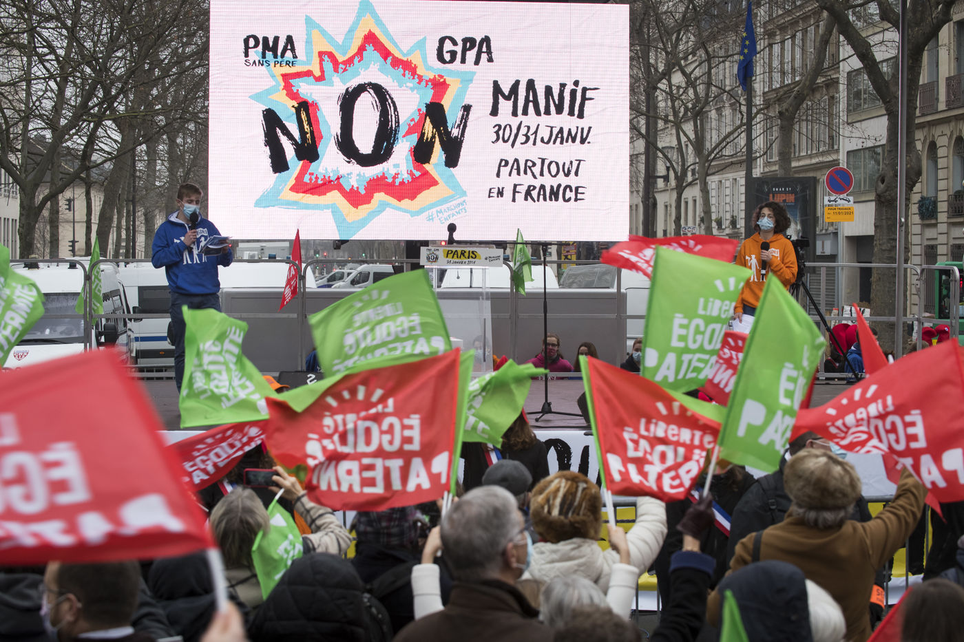 At the call of La Manif Pour Tous, several thousand demonstrators gathered against the bioethical law, the fatherless PMA (Procéation Médicalement Assistée) open to all and the GPA (Gestation Pour Autrui), in front of the Ministry of Solidarity and Health.