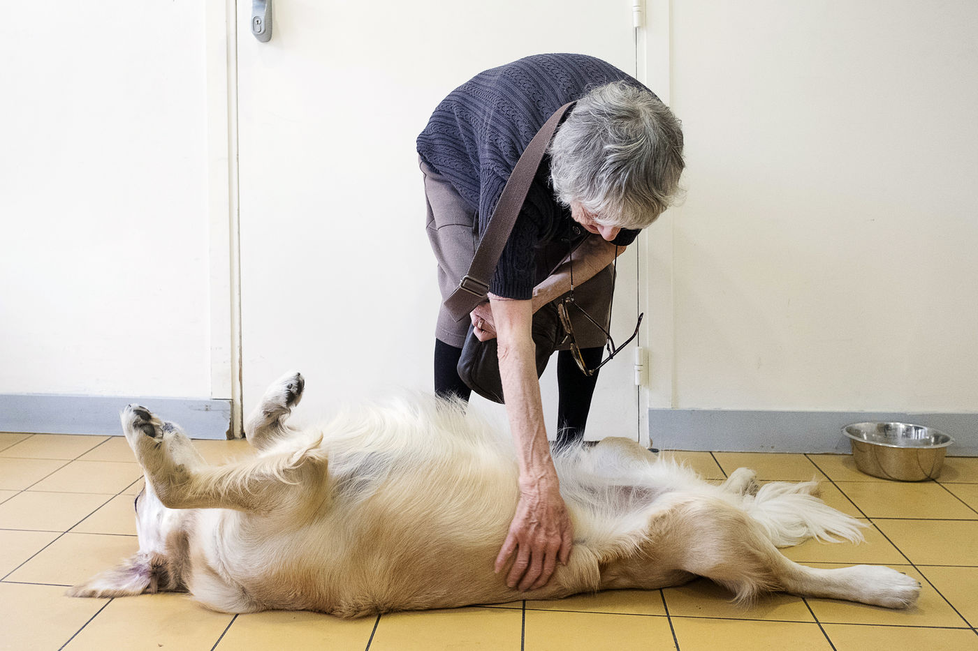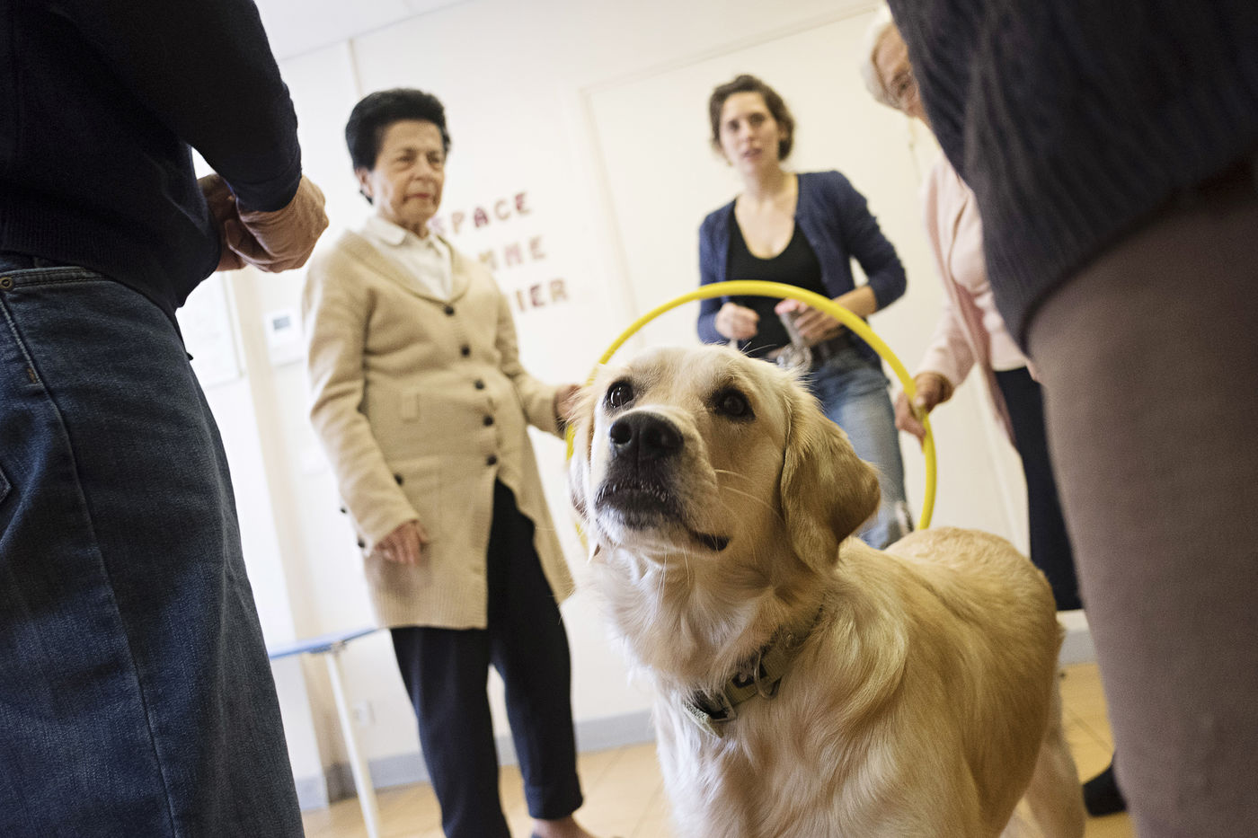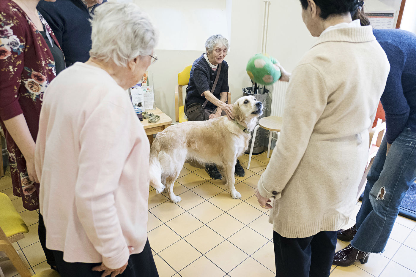 Pet therapy workshop with the dog Nova, in the fight against Alzheimer's disease. Espace Jeanne Garnier in Paris.