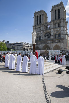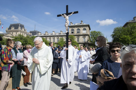 Holy Week - Good Friday - meditation and veneration of the Cross on the square of the Notre-Dame de Paris cathedral.