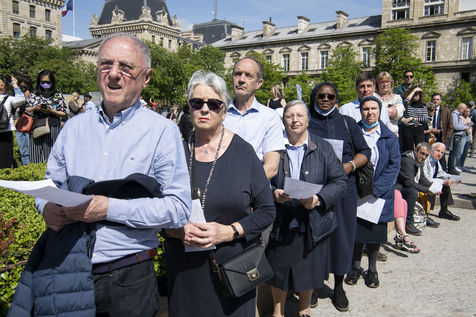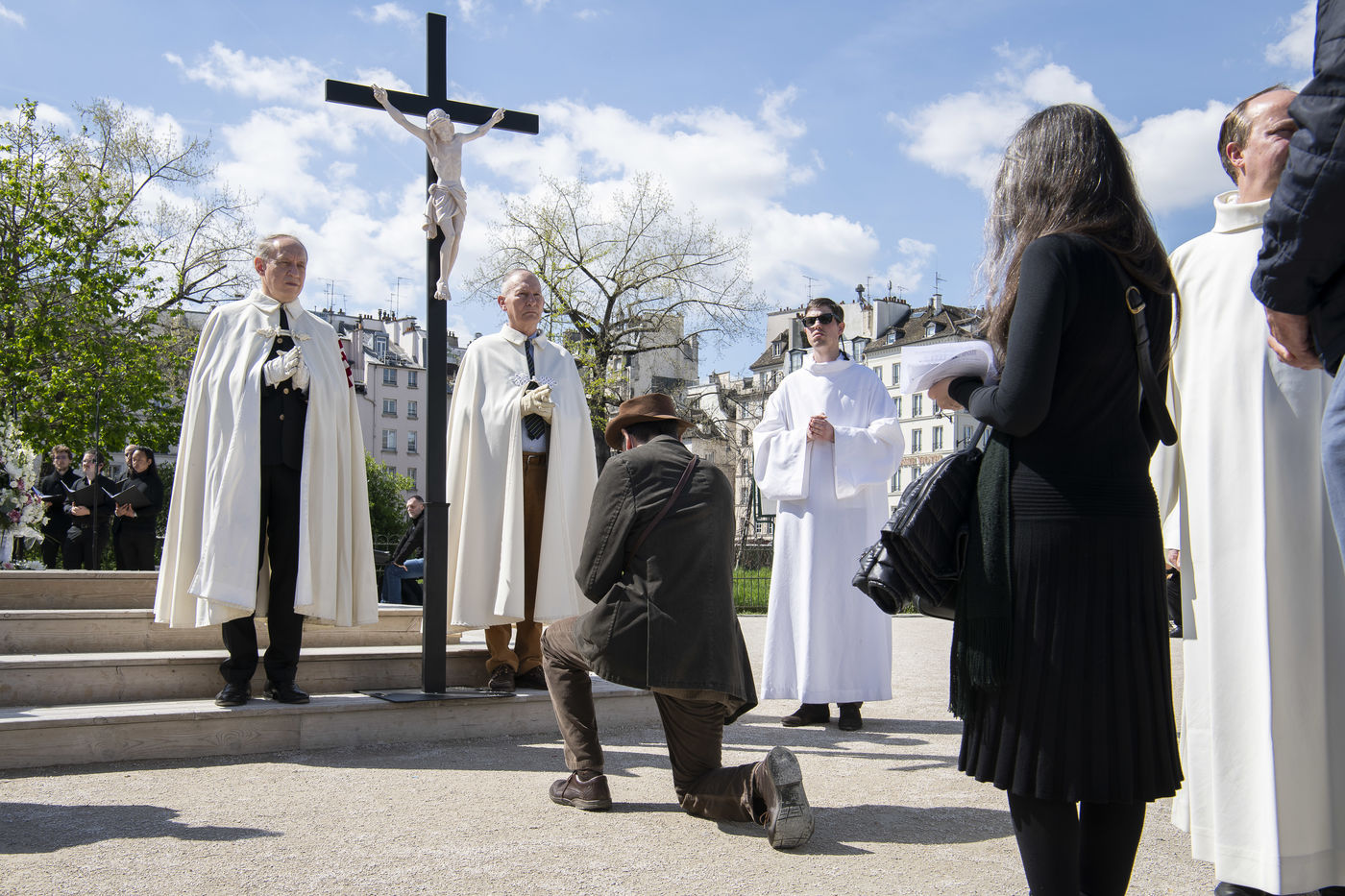 Semaine Sainte - vendredi Saint - meditation et veneration de La Croix sur le parvis de la cathédrale Notre-Dame de Paris.
