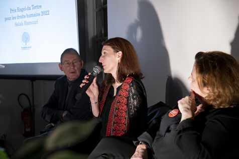 La Fondation ACAT pour la dignité humaine décerne son Prix des droits humains Engel-du Tertre 2022 à Salah Hamouri pour son engagement en faveur des droits humains en Palestine. Actuellement en détention administrative, c'est sa femme Elsa Lefort qui reçoit le prix pour son mari.