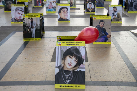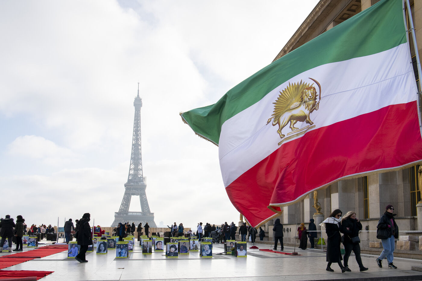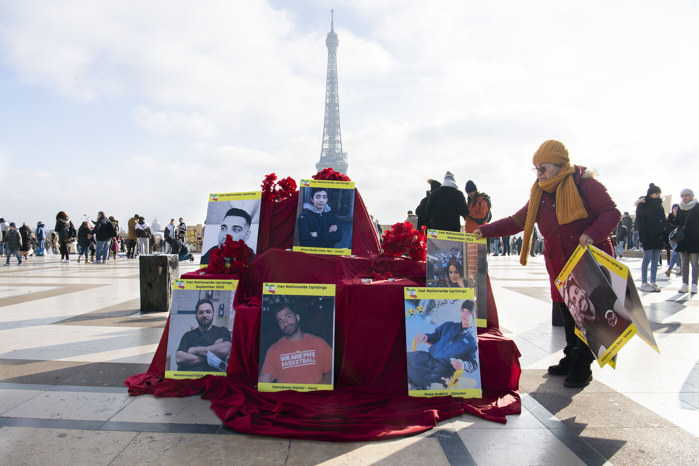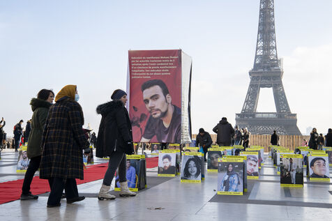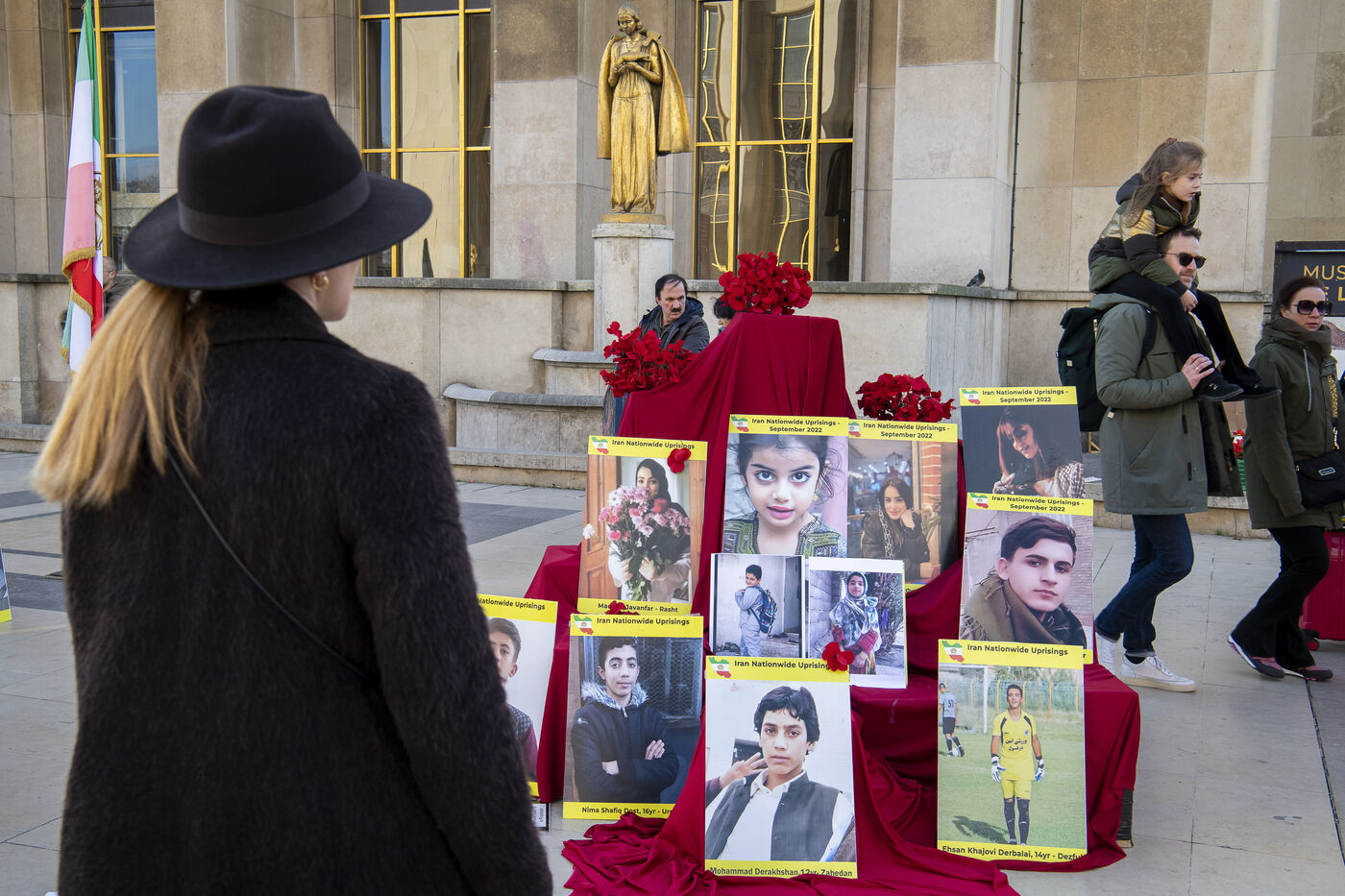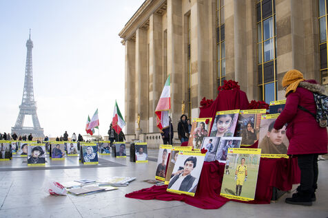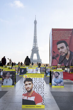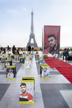 Journée internationale des droits de l'Homme : Rassemblement en soutien au soulevement en Iran, sur le parvis des droits de l'Homme au Trocadero, où sont exposés les portraits des victimes de la police et de l'Etat iranien.