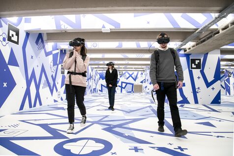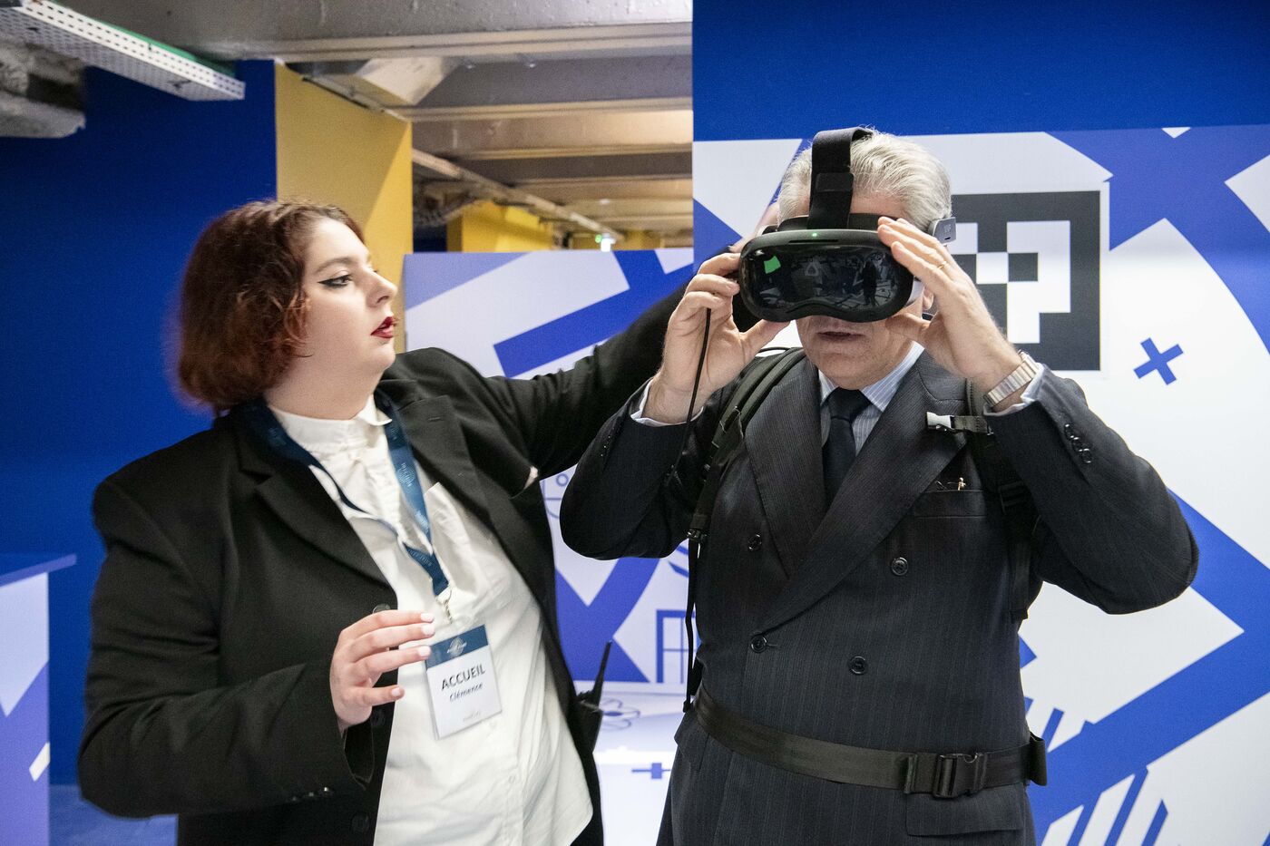 Inauguration de l'exposition-spectacle "Eternelle Notre-Dame" sous le parvis de la cathédrale Notre-Dame de Paris. Des visiteurs vivent l'expédition immersive en réalité virtuelle.