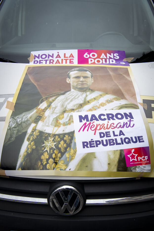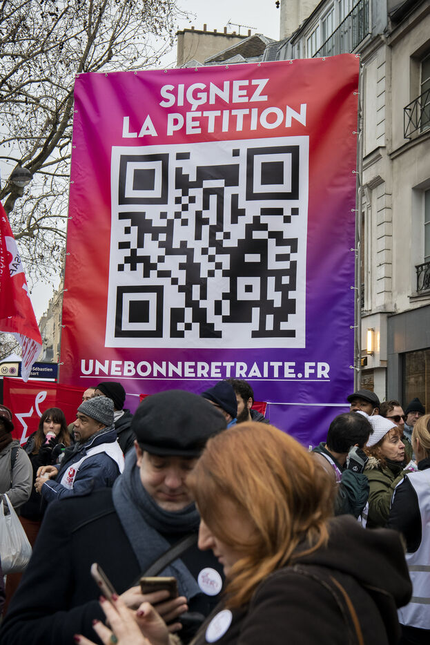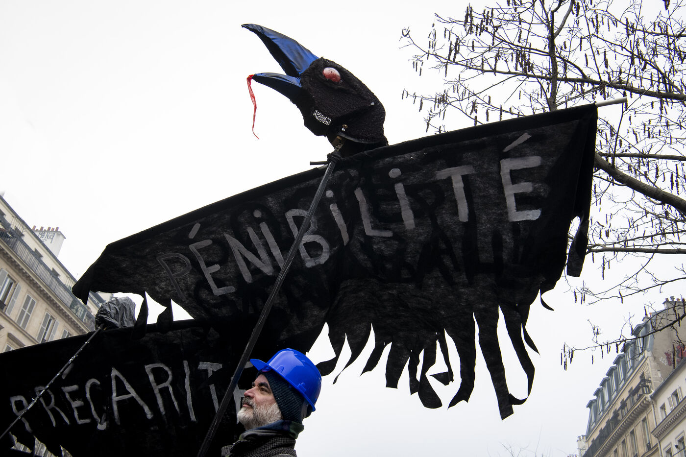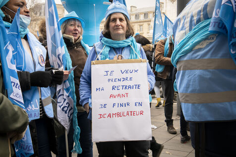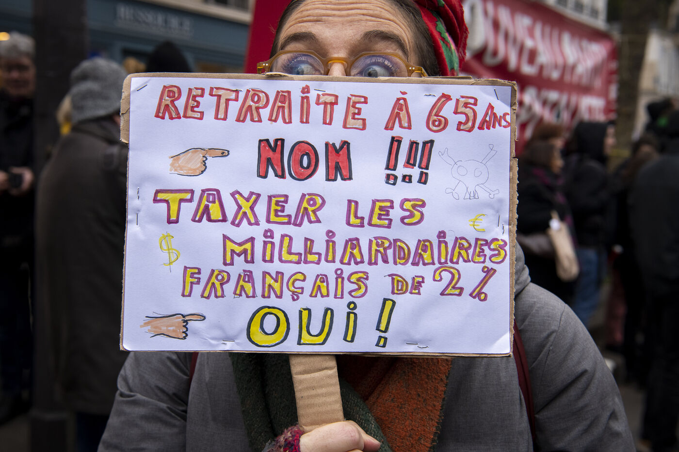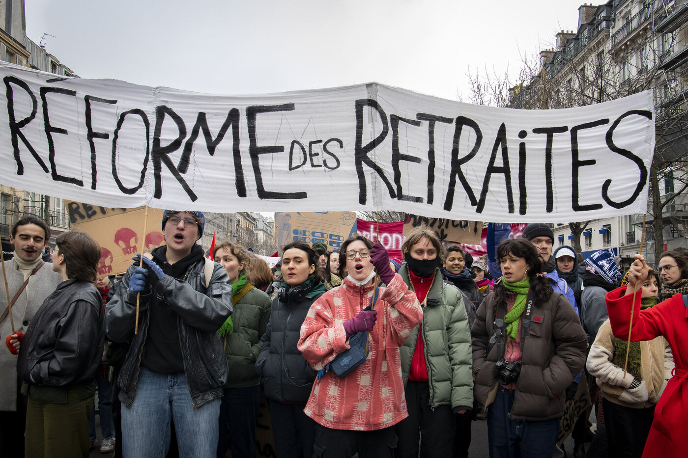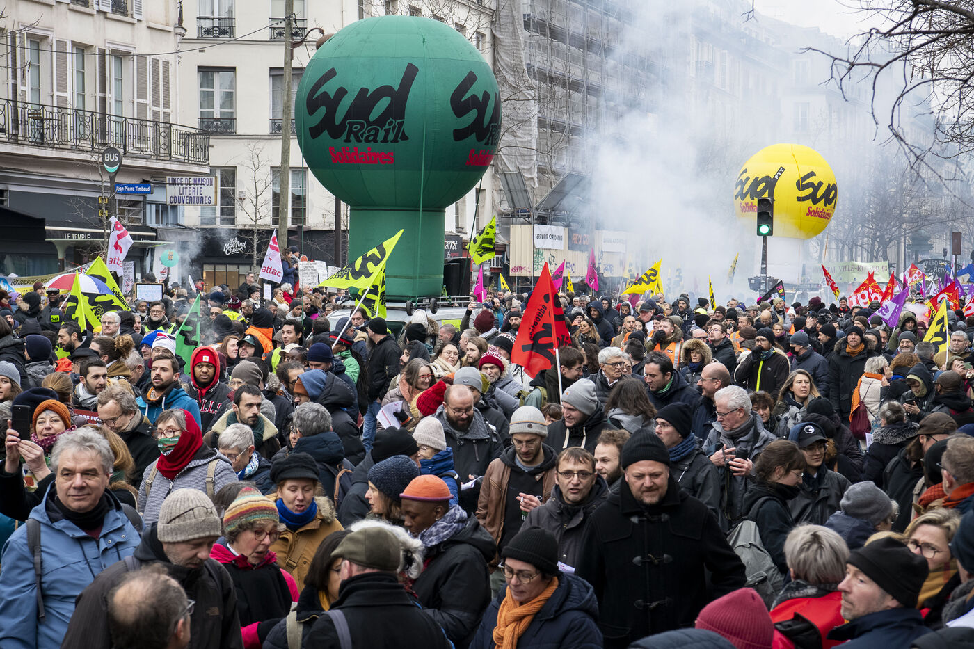 Manifestation contre la réforme des retraites. Première journée de mobilisation intersyndicale contre l'annonce du report de l'âge légal de la retraite à 64 ans, présenté par la première ministre Elisabeth Borne.