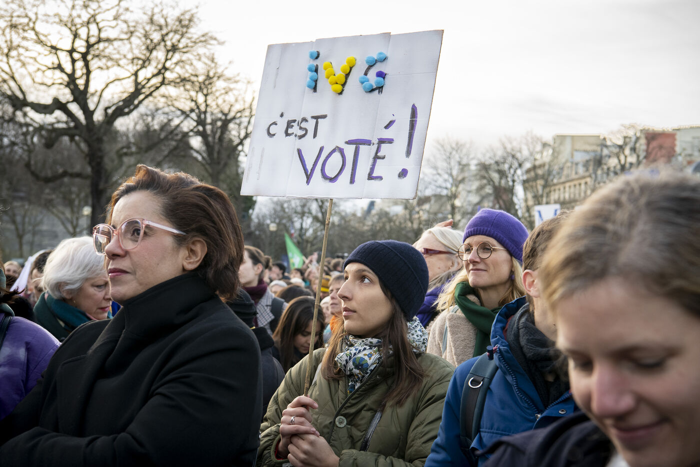 Rassemblement Place des droits de l'Homme à l'occasion du vote par le Congrès de l'inscription de l'interruption volontaire de grossesse (IVG) dans la Constitution.