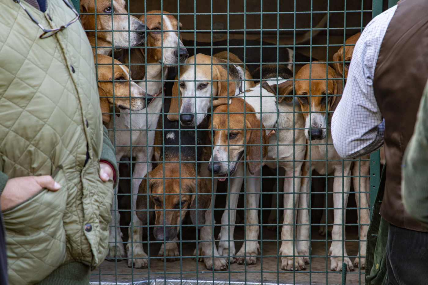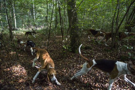 Chasse à courre en forêt de Chantilly avec une quinzaine de veneurs du Rallye Pic'Hardi Chantilly. Ils sont accompagnés d'une vingtaine de chiens de la race anglo-français dressés pour la recherche du chevreuil.