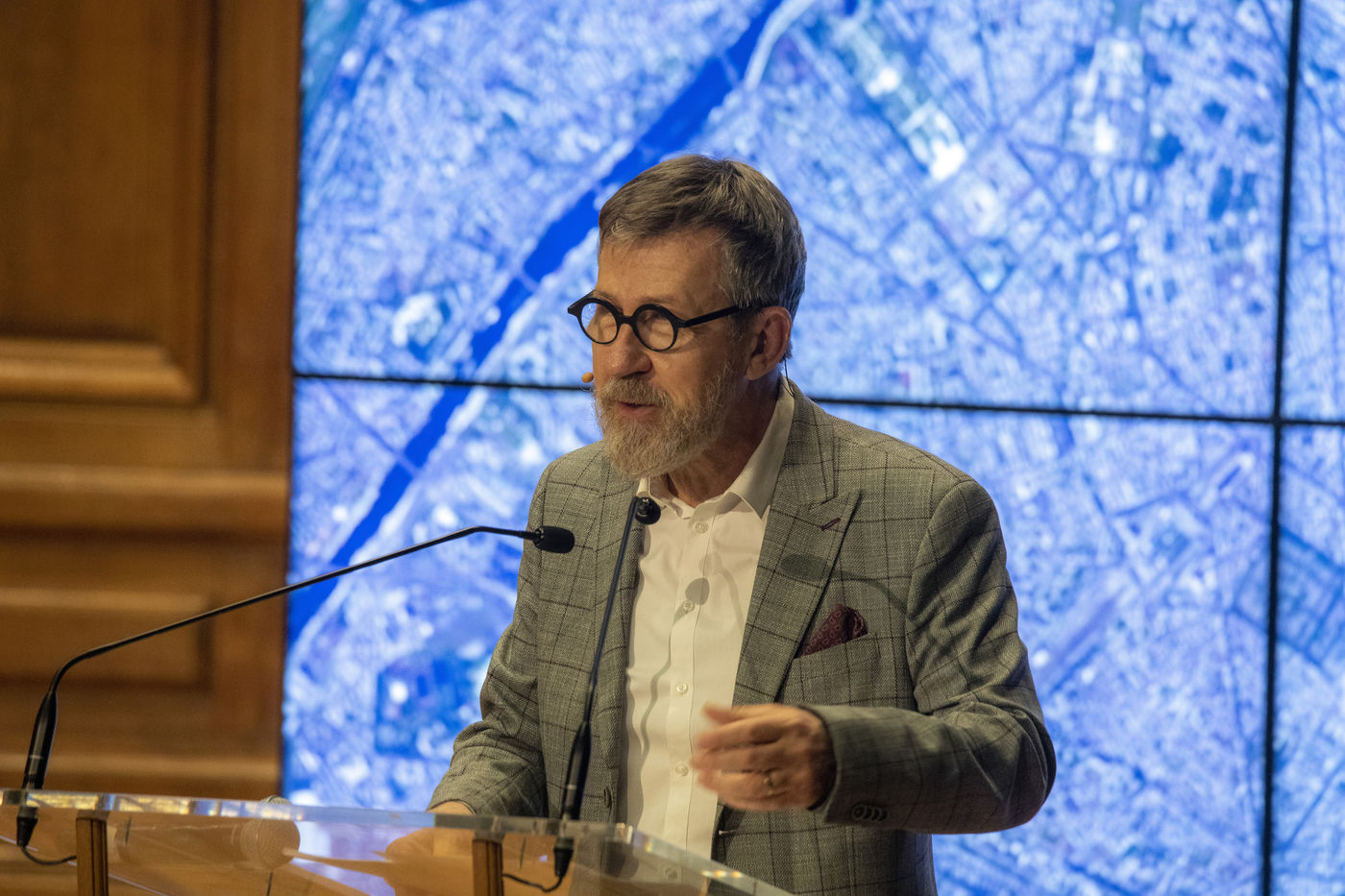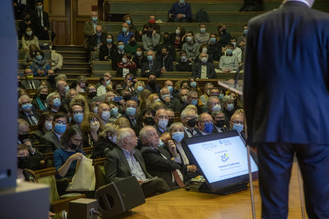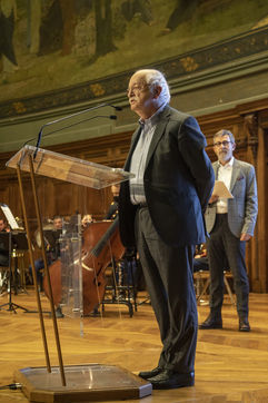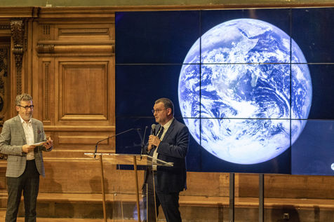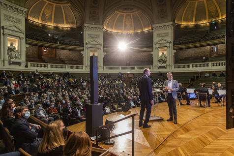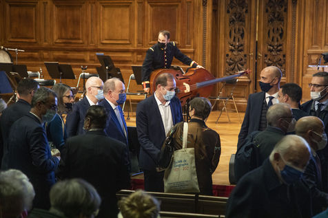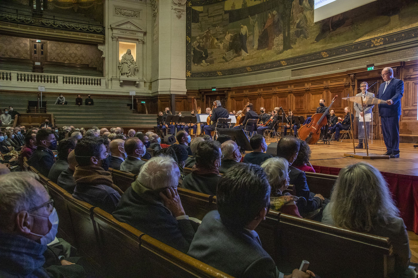 France, Paris, 2021-12-15, La Societe de Geographie, qui fête son bicentenaire, a organisé une cérémonie dans le grand amphitheatre de La Sorbonne en presence de personnalites dont SAS Albert II de Monaco, Erik Orsenna, Christian Prudhomme, au son de l'orchestre de la Garde Républicaine. L'évènement était animé par Jamy Gourmaud.
