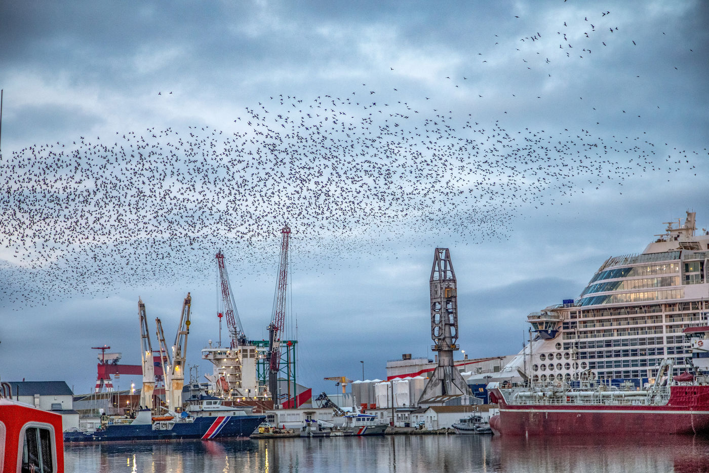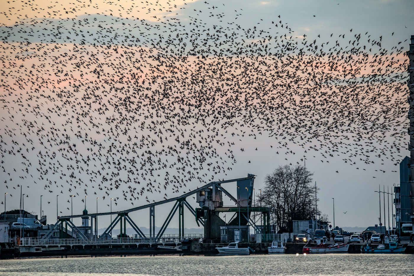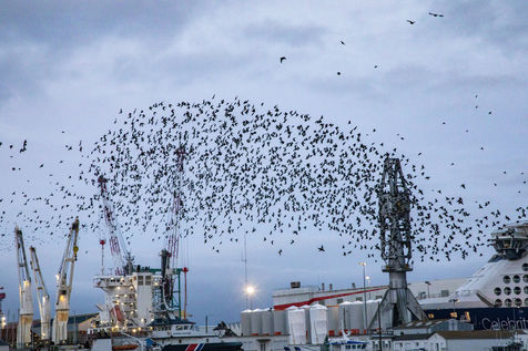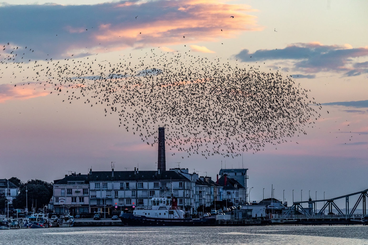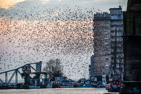 Every year, thousands of starlings settle around the submarine base of Saint-Nazaire. At sunset, they arrive in groups from the surroundings and gather above the port. They circle in tight rows in a majestic ballet. The municipality tries to chase them away so that they resume their migration towards the south, because they damage trees, vehicles, building facades, urban furniture, sidewalks with their droppings...