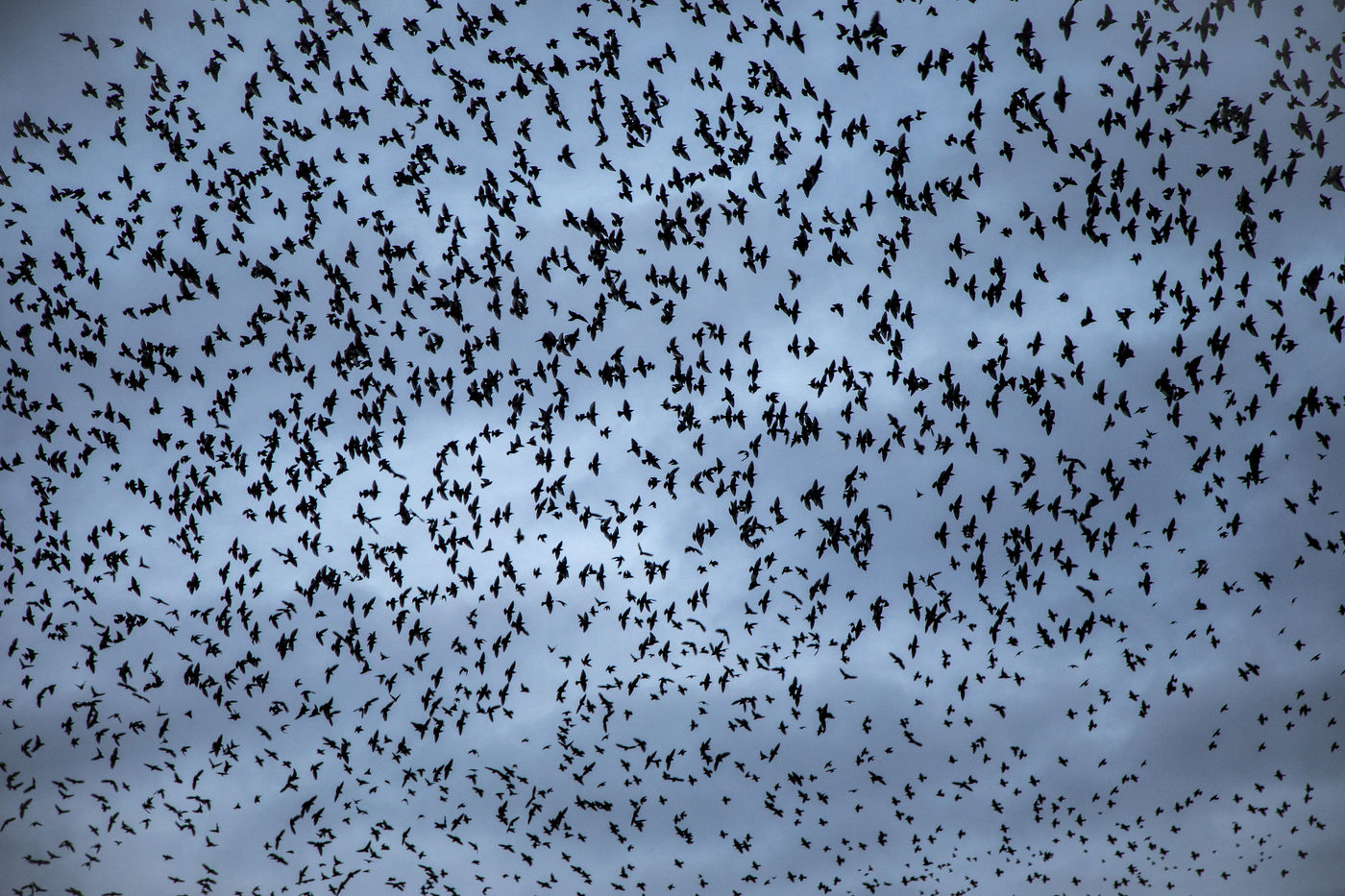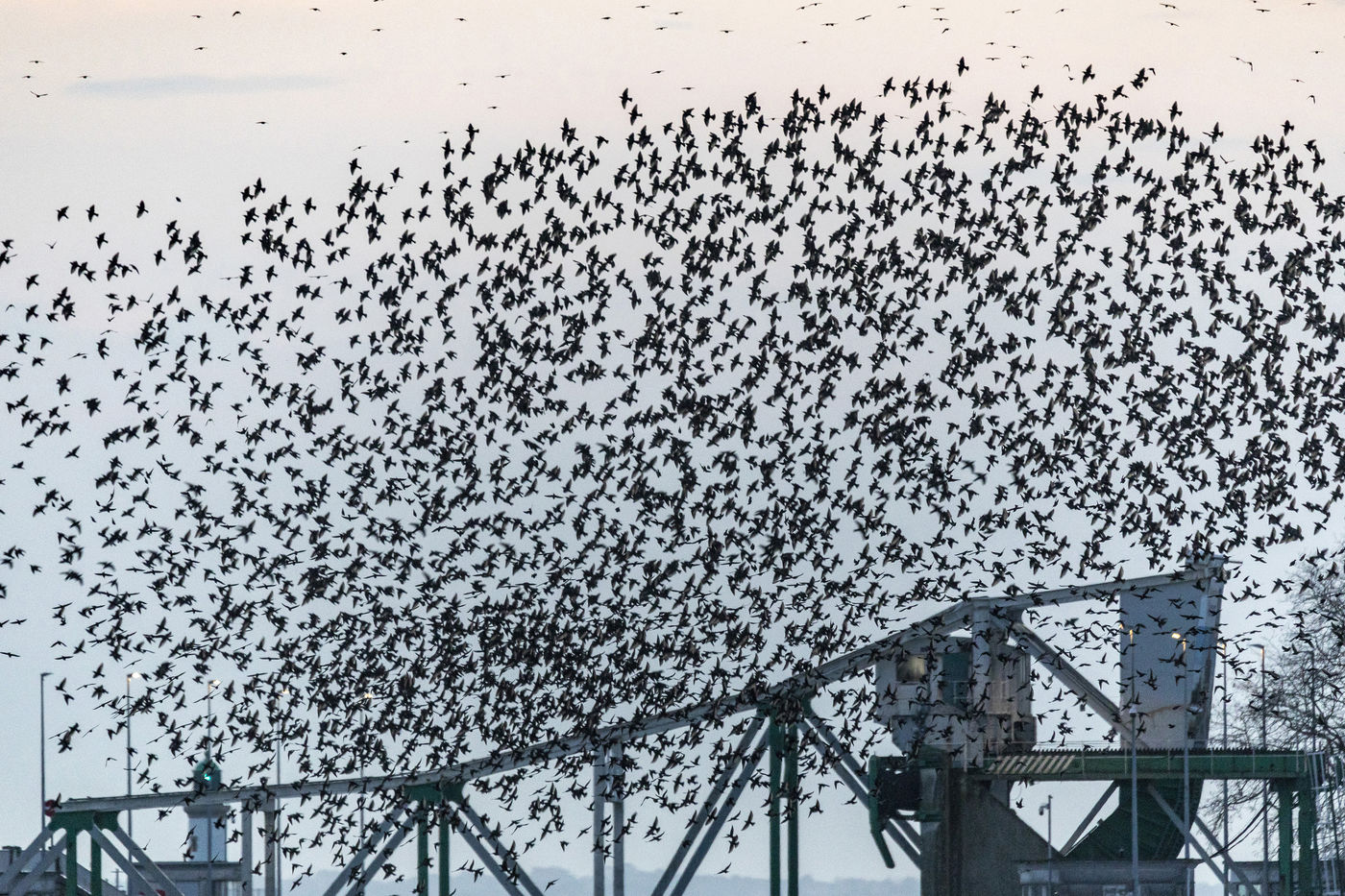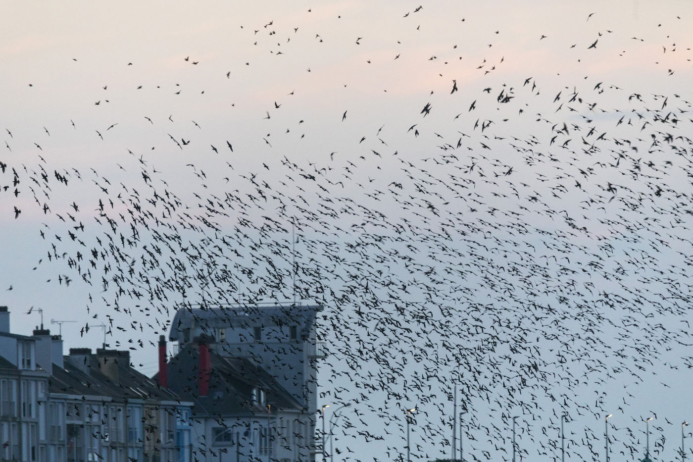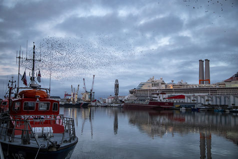 Every year, thousands of starlings settle around the submarine base of Saint-Nazaire. At sunset, they arrive in groups from the surroundings and gather above the port. They circle in tight rows in a majestic ballet. The municipality tries to chase them away so that they resume their migration towards the south, because they damage trees, vehicles, building facades, urban furniture, sidewalks with their droppings...