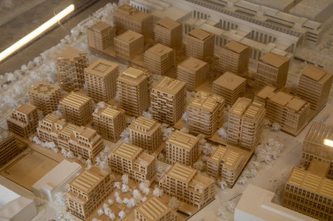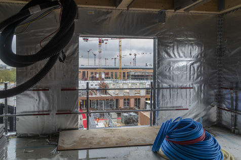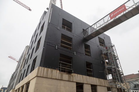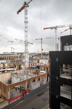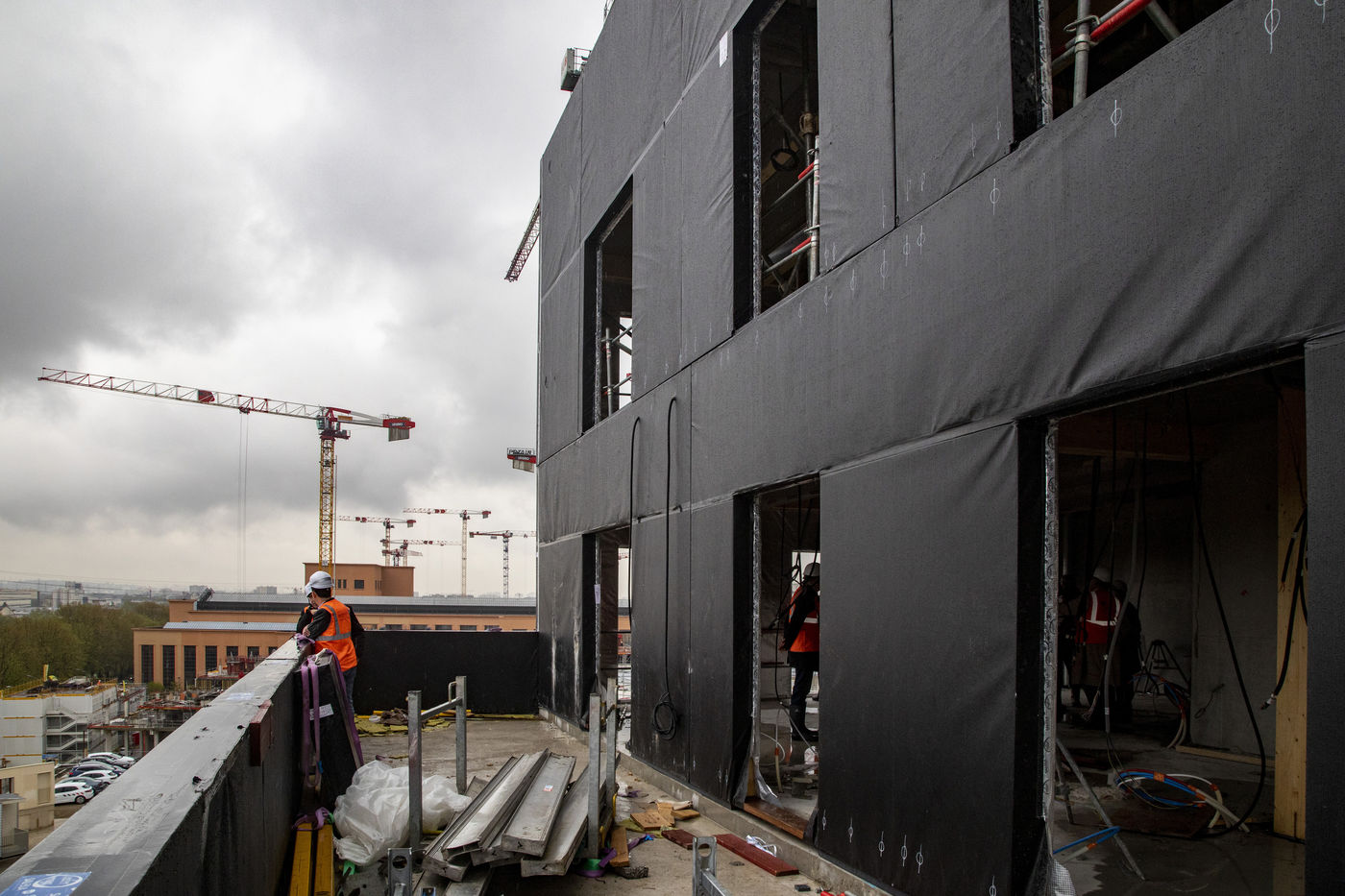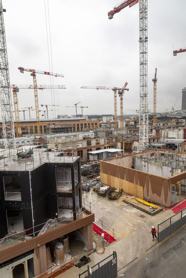 France, Saint-Ouen-sur-Seine, 2022-04-13. Work on the Athletes' Village, the site that will host more than 14,000 participants and their attendants at the Paris 2024 Olympic Games, began in April 2021. A real estate program of 527 housing units is being built little by little and the work is progressing. In sector E, one of the largest single-site projects in France, led by Eiffage, Nexity, and CDC Habitat, nearly 4,000 construction craftsmen are working on the construction of 19 buildings that will be completed on March 1, 2024. Photography by Caroline PAUX / Hans Lucas.