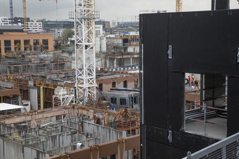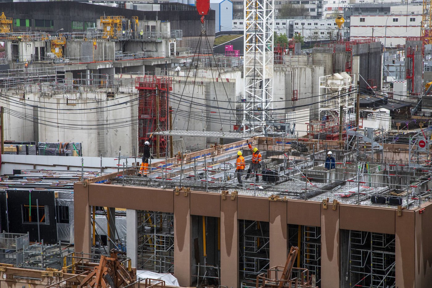 France, Saint-Ouen-sur-Seine, 2022-04-13. Les travaux du village des Athlètes, le site qui accueillera plus de 14 000 participants, et leurs accompagnants, aux Jeux Olympiques Paris 2024, ont démarré en avril 2021. Un programme immobilier de 527 logements voit le jour petit à petit et les travaux progressent. Au niveau du secteur E, un des plus grands chantiers mono site de France, mené par Eiffage, Nexity, CDC Habitat, près de 4 000 artisans du bâtiment travaillent sur la construction de 19 immeubles qui devront Être termine le 1er mars 2024. Photographie par Caroline PAUX / Hans Lucas