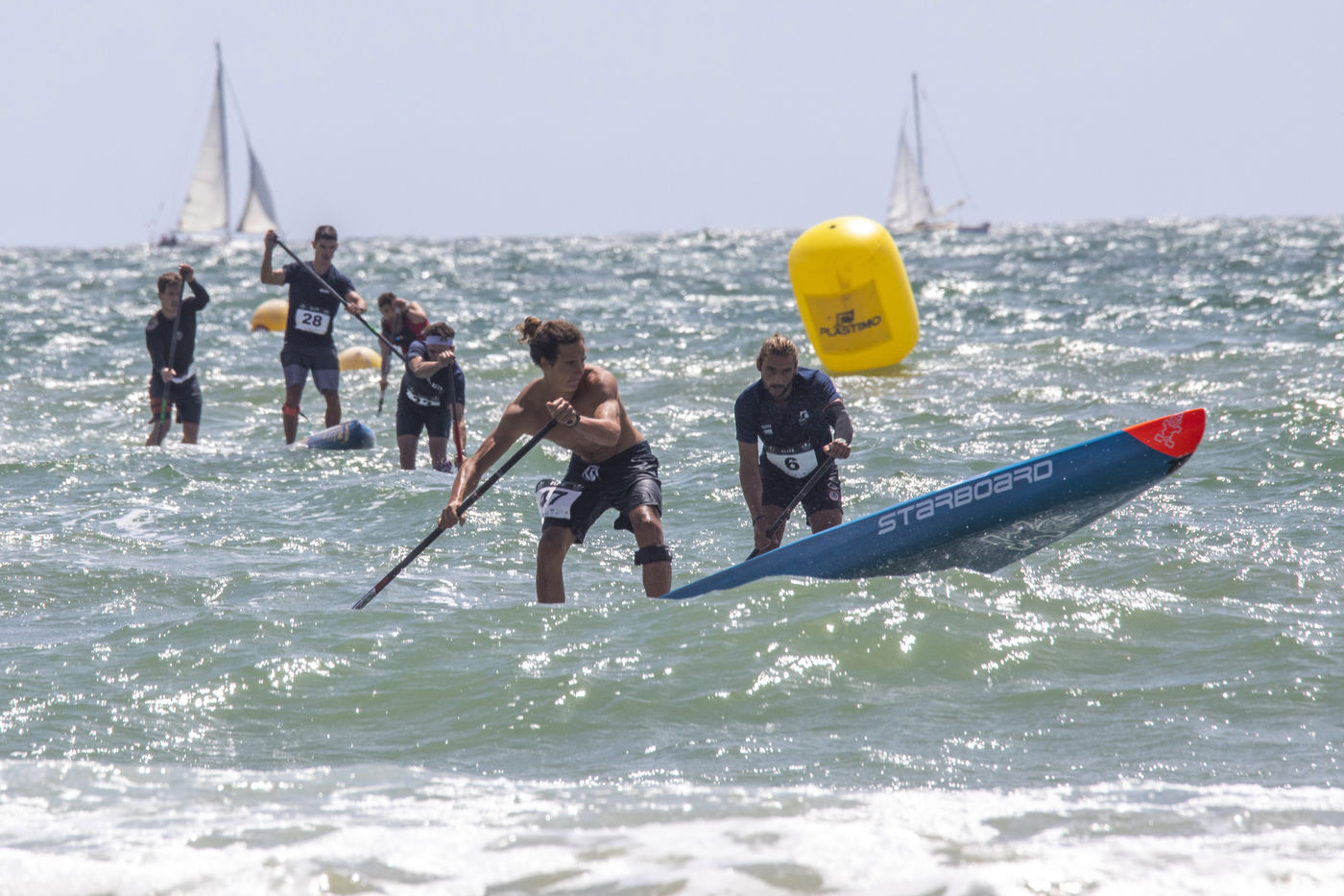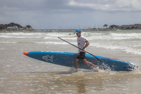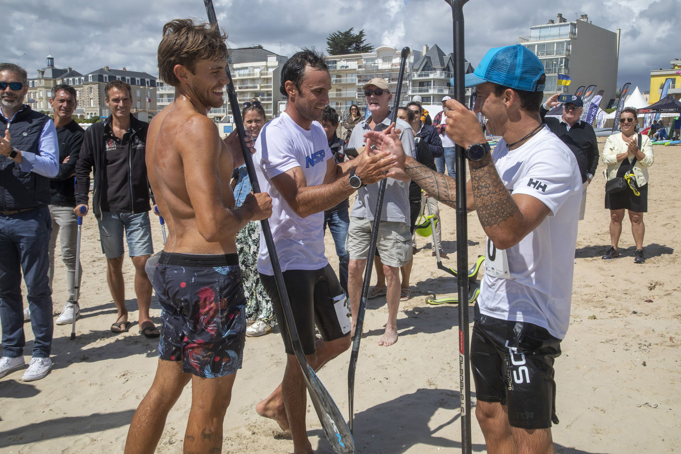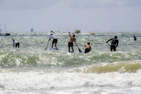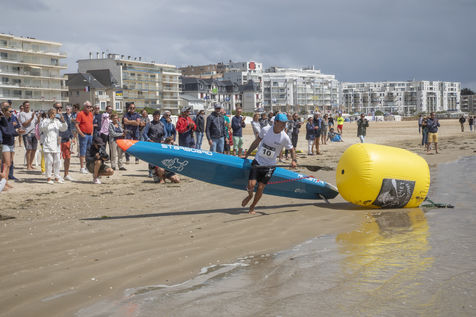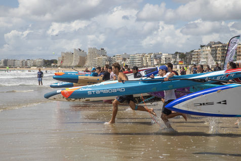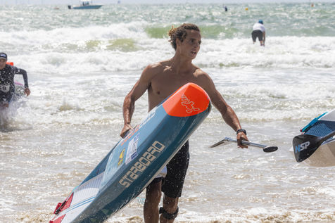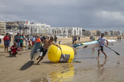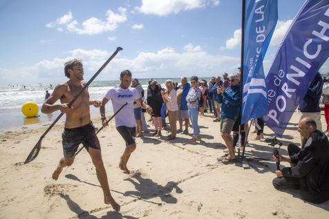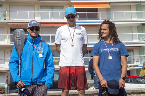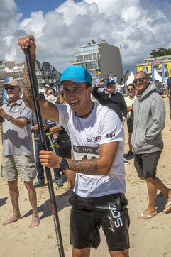 France, Pornichet, 2022-06-25. Les meilleurs athlètes mondiaux du paddle se sont retrouvés à Pornichet pour la 5eédition du Paddle Trophy. Ils ont notamment participé au Beach Race Elite, une course technique rendue très difficile par les conditions météo, vent et vague. Trois Néo-Calédonniens arrivent en tête. Noïc Garioud, un des meilleurs pagayeurs au monde, remporte l?épreuve, devant un autre grand champion, Titouan Puyo, plusieurs fois champions de France, d?Europe et du monde, et le jeune espoir Clément Colmas, également champion de Wingfoil. En 4e position arrive le champion australien Ty Judson.