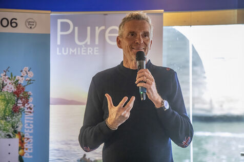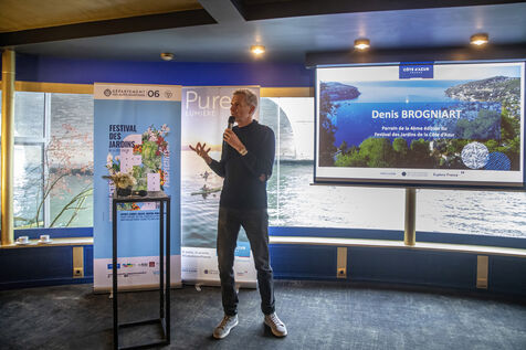 France, Paris, 2022/12/06. Denis Brogniart will be the patron of the 4th Edition of the French Riviera Garden Festival organized from March 25 to May 1, 2023. He was present, along with Jean Mus, international landscape designer and President of the Festival's technical committee, at the press conference given by the Comité Régional du Tourisme de la Cote d'Azur on a barge in Paris. Photography by Caroline Paux / Hans Lucas.