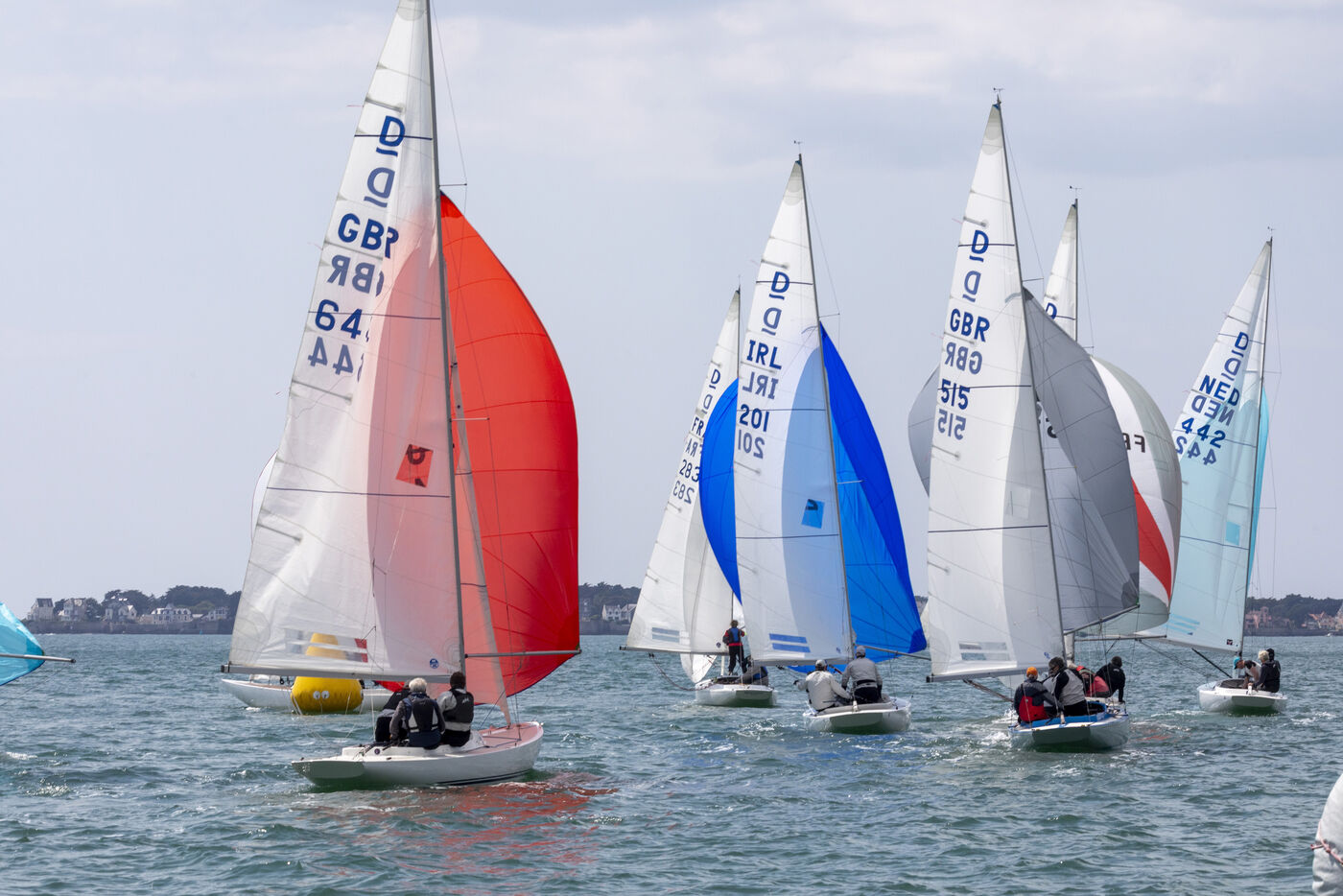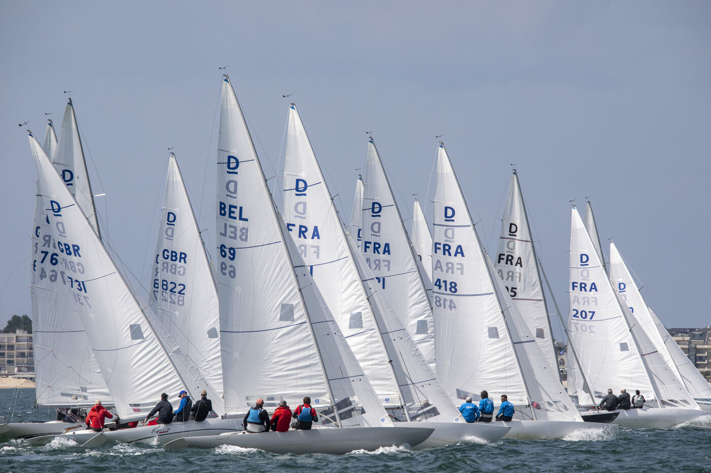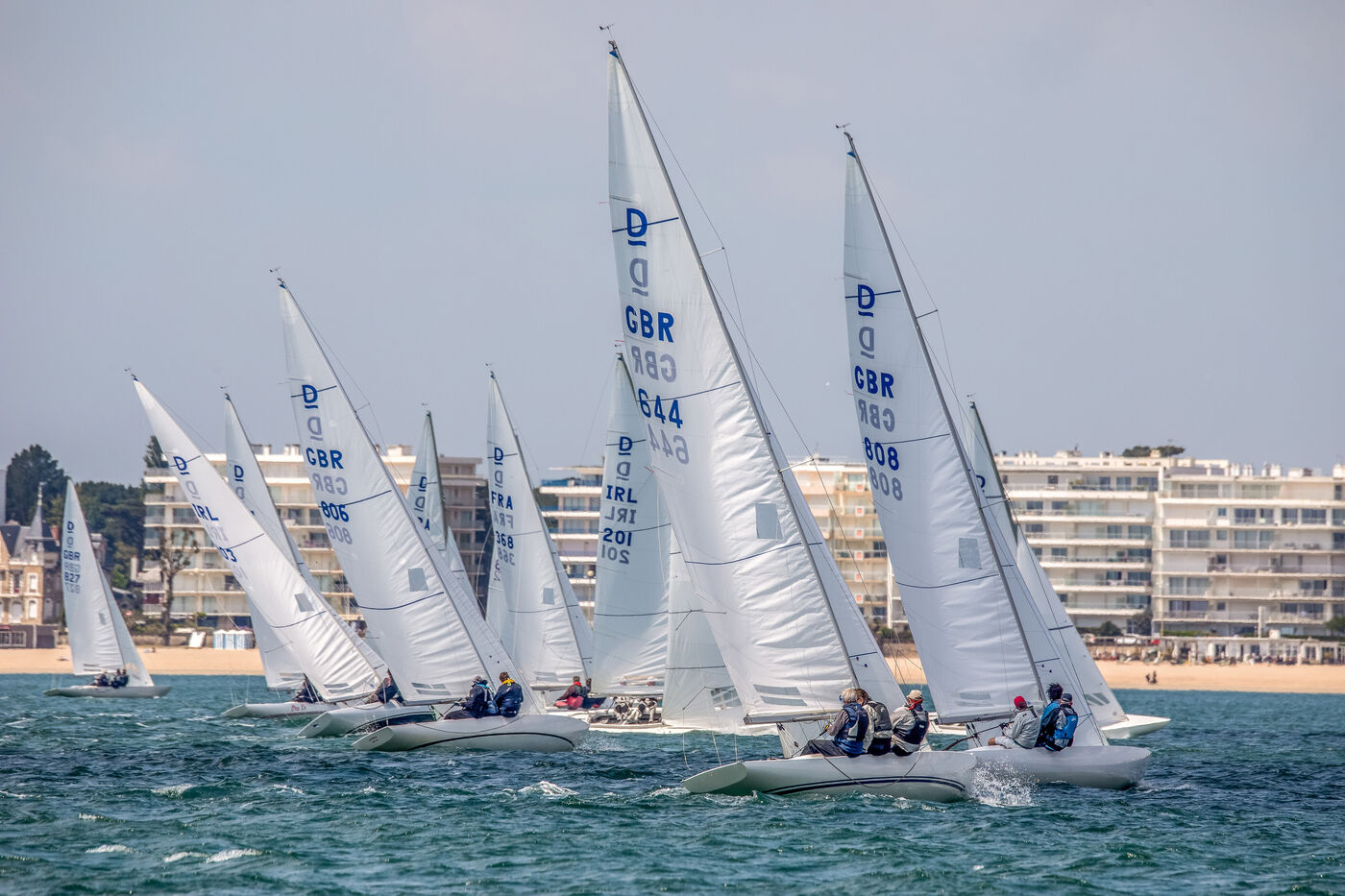 France, La Baule, 2023/05/17. Beginning of the International Dragon Derby of La Baule, organized by the Yacht-club of La Baule from May 17 to 20, 2023. Six nations are represented: twelve English boats, three Irish, four Dutch, three Belgians, one German and twelve French. At the end of the first day, the crew of Douanenez composed of Frédéric and Charlotte Gourlaouen and Jean-François Le Goff, is in the lead among the professionals. Photo by Caroline Paux / Hans Lucas.