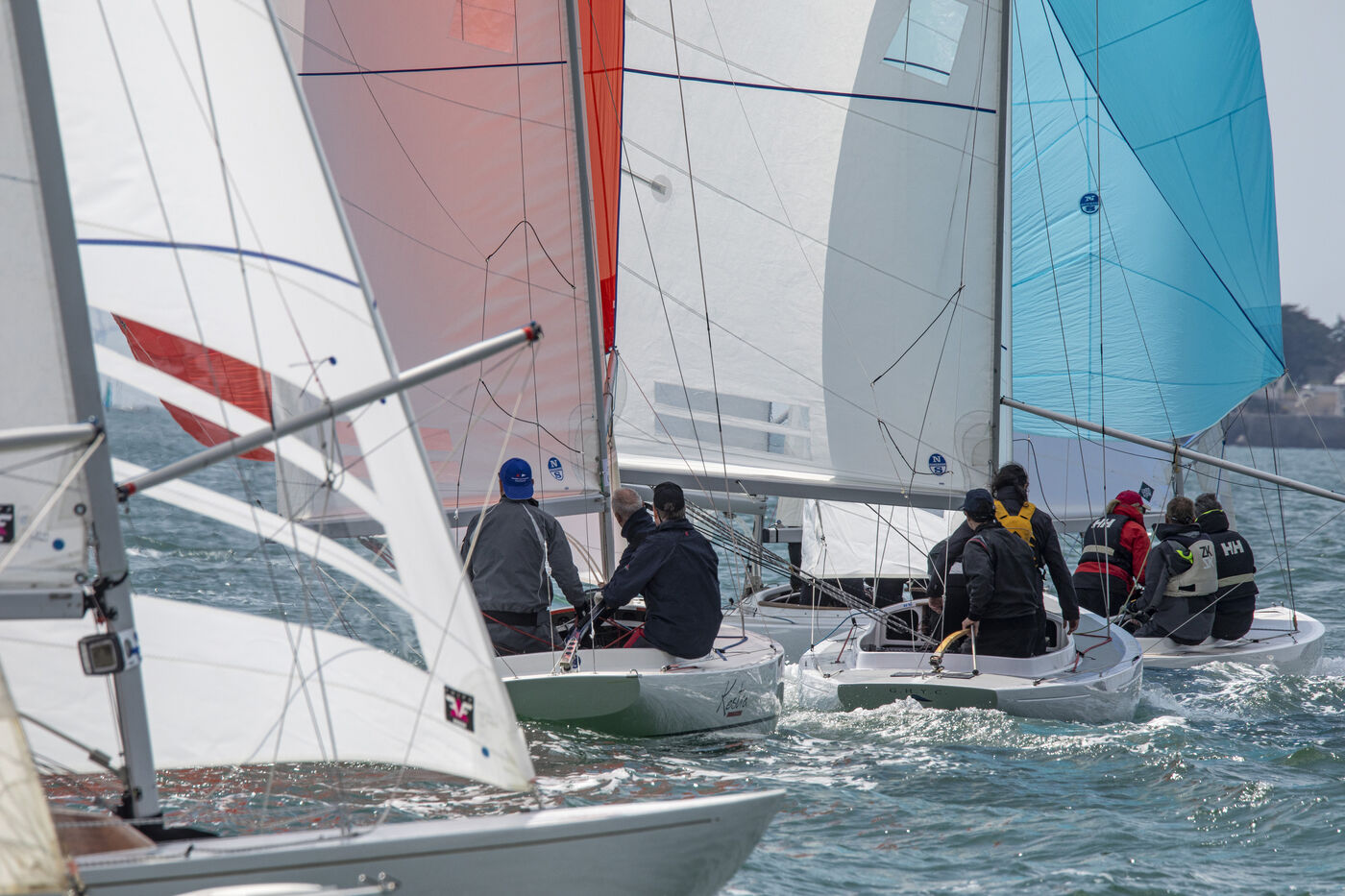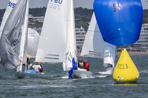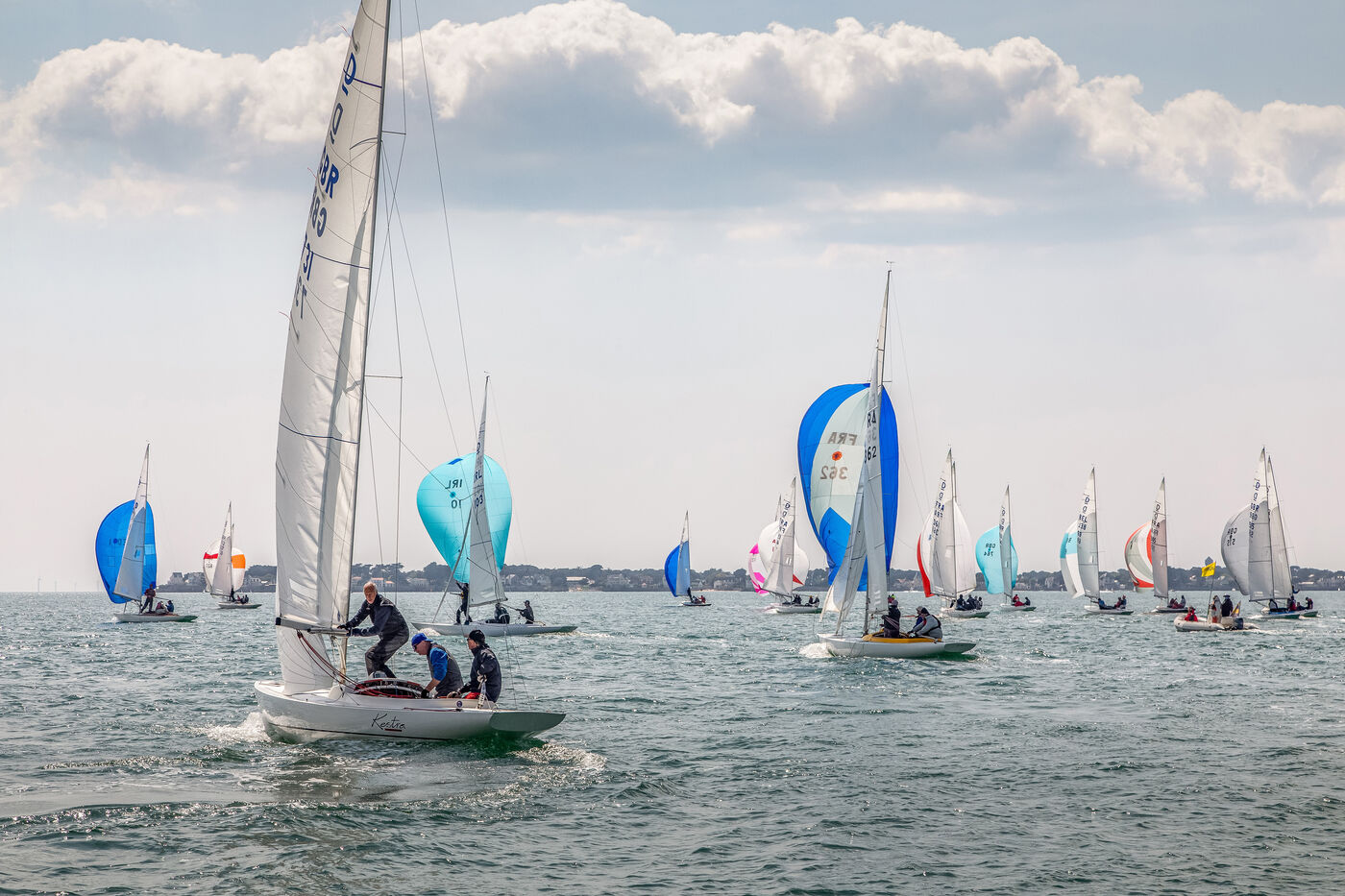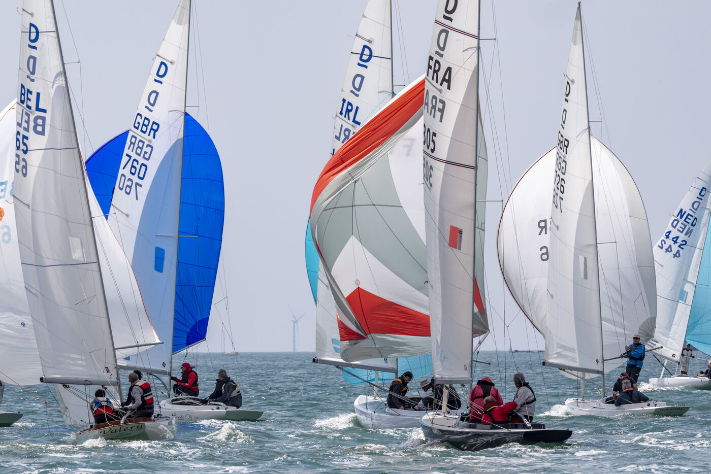 France, La Baule, 2023/05/17. Beginning of the International Dragon Derby of La Baule, organized by the Yacht-club of La Baule from May 17 to 20, 2023. Six nations are represented: twelve English boats, three Irish, four Dutch, three Belgians, one German and twelve French. At the end of the first day, the crew of Douanenez composed of Frédéric and Charlotte Gourlaouen and Jean-François Le Goff, is in the lead among the professionals. Photo by Caroline Paux / Hans Lucas.