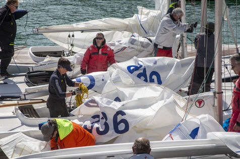 France, La Baule, 2023/05/17. Début du Derby Dragon international de La Baule, organisé par le Yacht-club de La Baule du 17 au 20 mai 2023. Six nations sont représentées : douze bateaux anglais, trois Irlandais, quatre Hollandais, trois Belges, un Allemand et douze Français. Au terme de la première journée, l?équipage de Douanenez composé de Frédéric et Charlotte Gourlaouen et Jean-François Le Goff, est en tête chez les professionnels. Photographie par Caroline Paux / Hans Lucas.