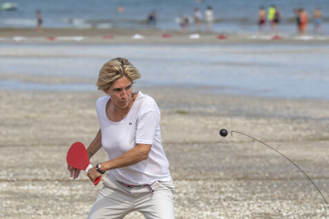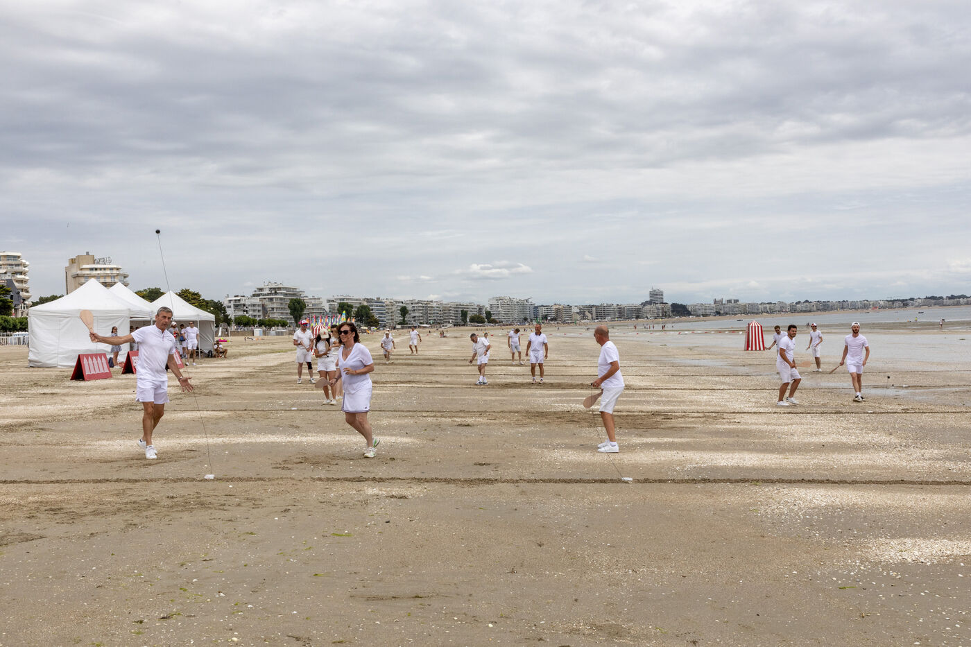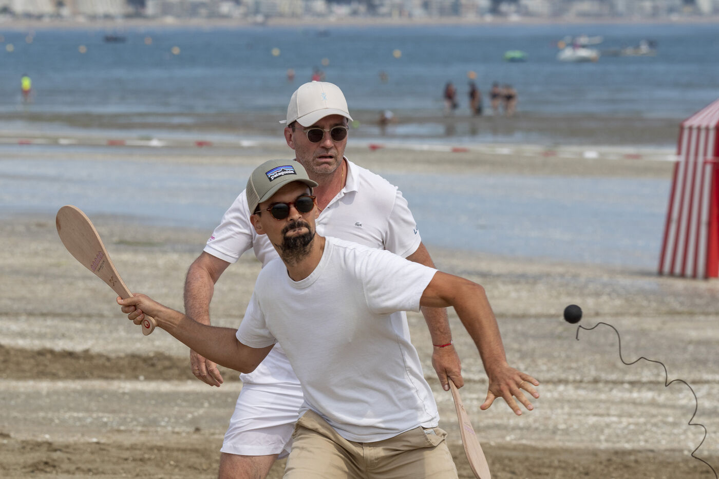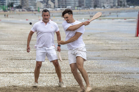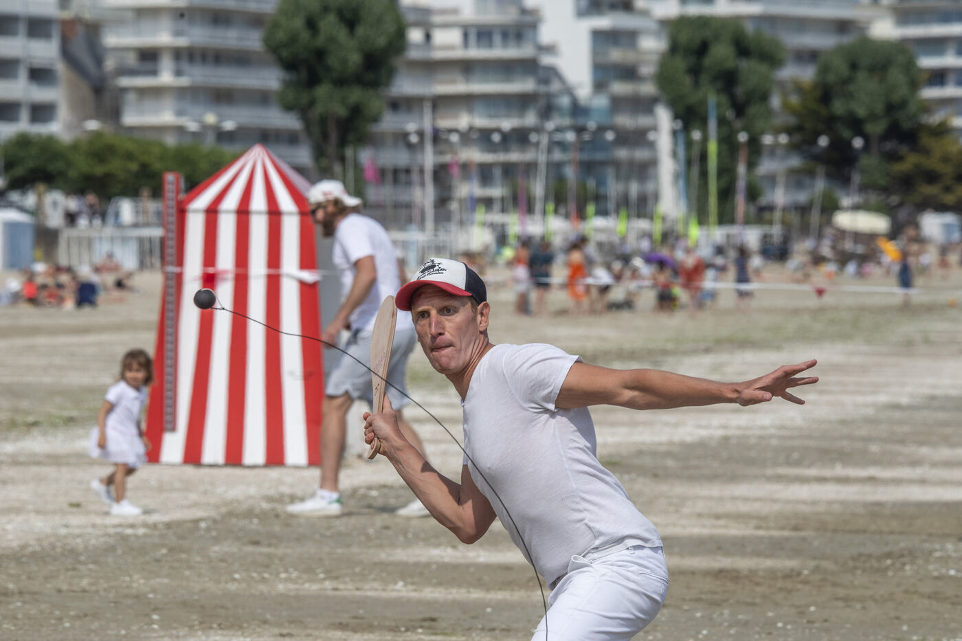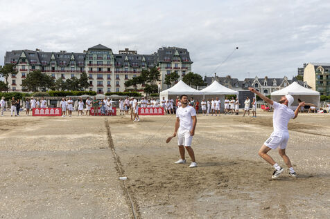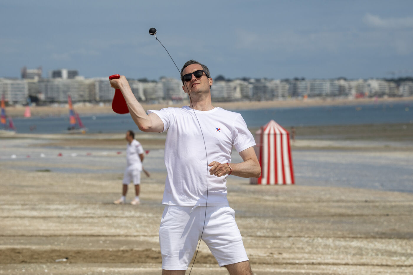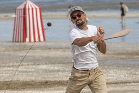France, La Baule, 2023-07-08. Maxime Brisson and Dylan Soalhat have created the Jokari Club, a movement to accelerate the development of Jokari and revive this iconic sport from the Basque country. A derby was organized on the beach at La Baule to show how this discipline, adapted for adults, is an attractive "urban beach sport" at a good level. The women's derby was won by Émilie Loit, a former professional tennis player, and the men's by Thomas Giraud. Photography by Caroline Paux / Hans Lucas.