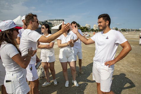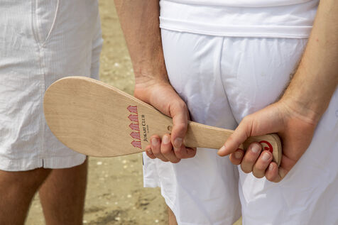 France, La Baule, 2023-07-08. Maxime Brisson et Dylan Soalhat ont créé le Jokari Club, un mouvement pour accélérer le développement du Jokari, faire renaître ce sport iconique venu du Pays basque. Un derby a été organisé sur la plage de La Baule pour montrer combien cette discipline, adaptée aux adultes, est un « sport de plage urbain » attractif et de bon niveau. Il a été remporté chez les femmes par Émilie Loit, ex-joueuse de tennis professionnelle, et chez les hommes, par Thomas Giraud. Photographie par Caroline Paux / Hans Lucas.