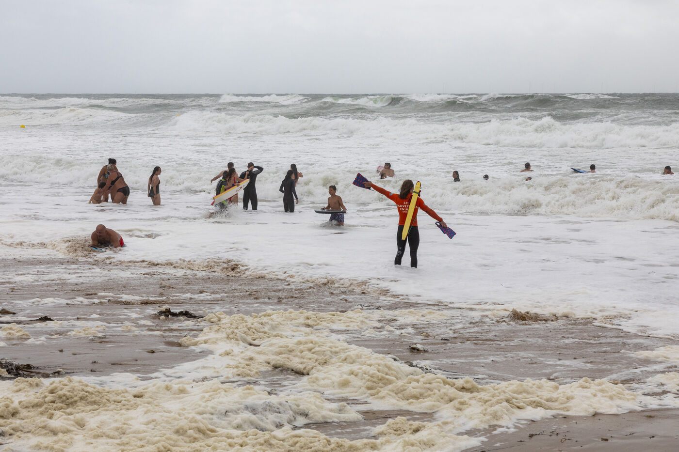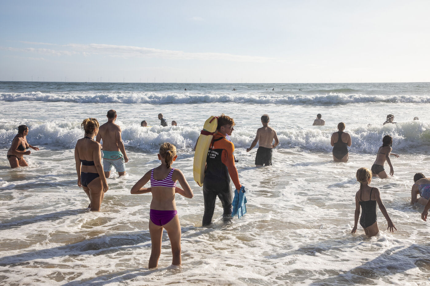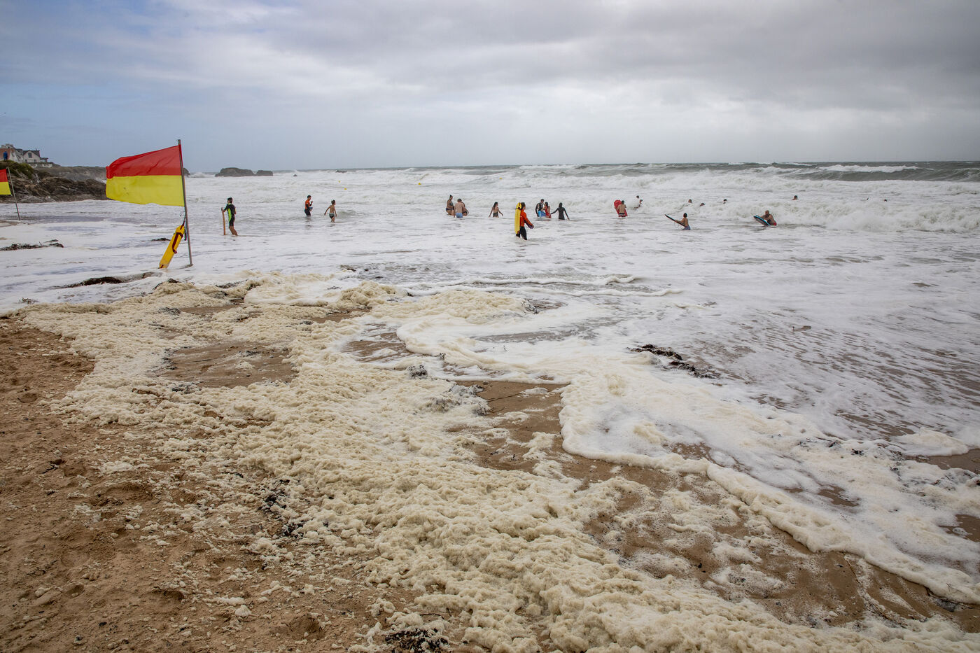 France, Batz-sur-Mer, 2023-08-30. Every day, SNSM rescue swimmers - the first link in the coastal rescue chain - patrolled the beaches of Batz-sur-Mer, Loire-Atlantique, all summer long. They played a crucial preventive role, informing bathers about sea conditions and areas at risk, ready to intervene if necessary. Their reassuring presence encouraged summer visitors to adopt safe behaviors, such as avoiding venturing too far out into the ocean or disregarding the new warning flags. Photography by Caroline Paux / Hans Lucas.
