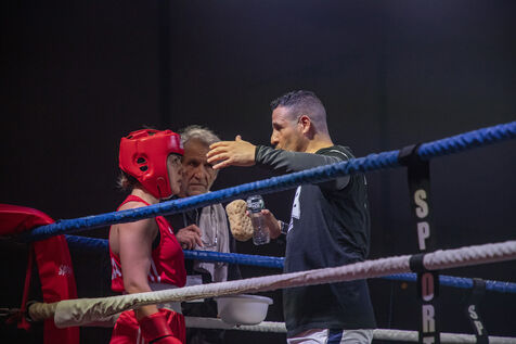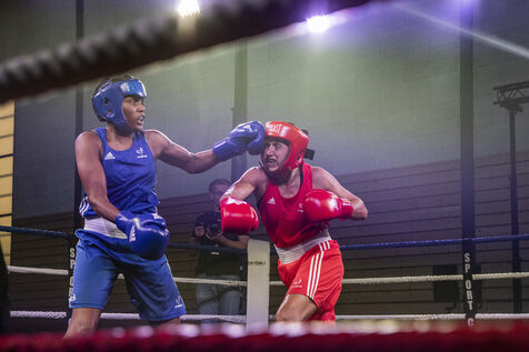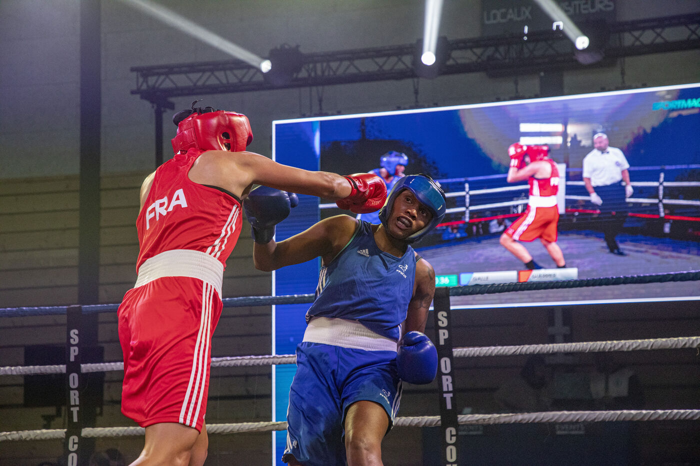 France, Deuil-La Barre, 16 décembre 2023. 22 combats de 3 rounds, organisés au complexe sportif Alain Mimoun de Deuil-la Barre, ont désigné les champions de France de boxe élites hommes et femmes dans les différentes catégories allant de 50 à +92 kg. Douze clubs français étaient représentés. Photographie par Caroline Paux / Hans Lucas.