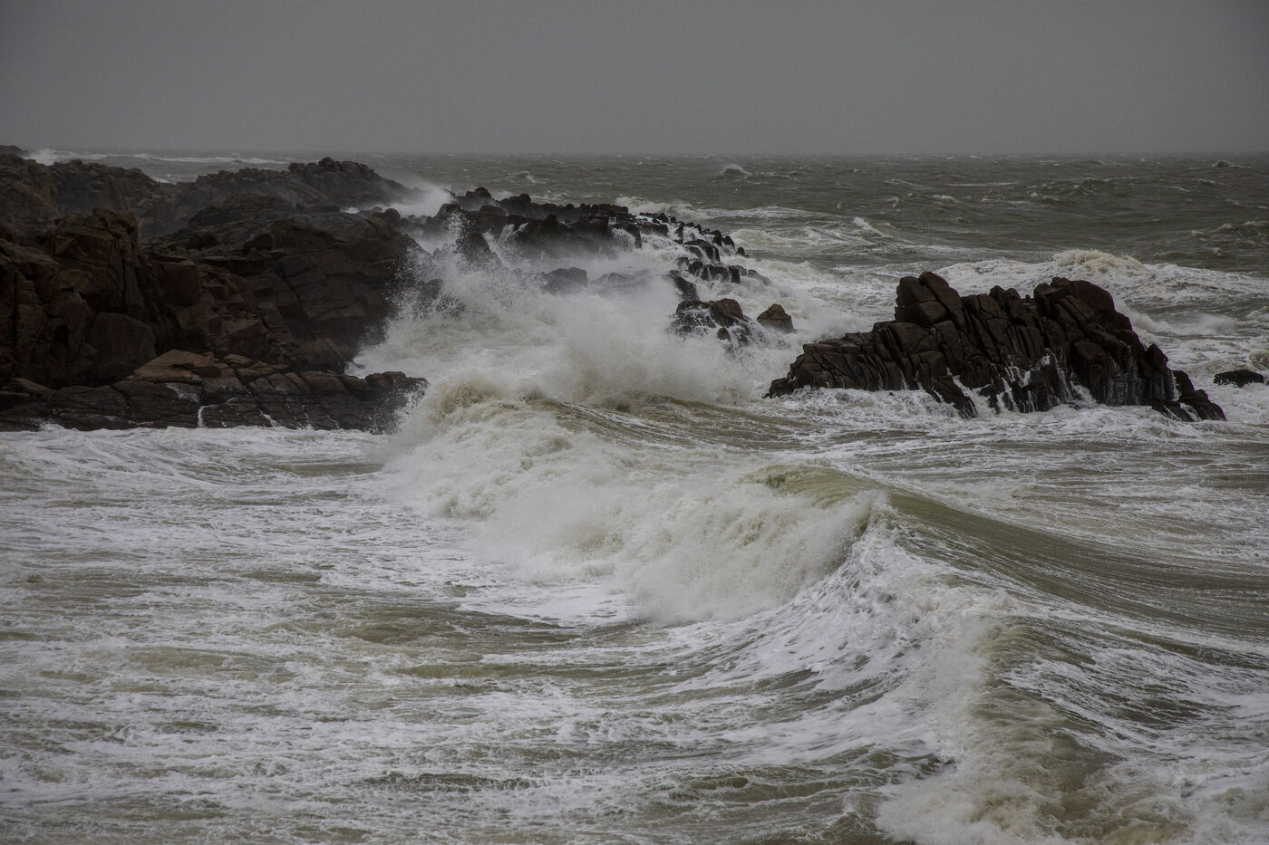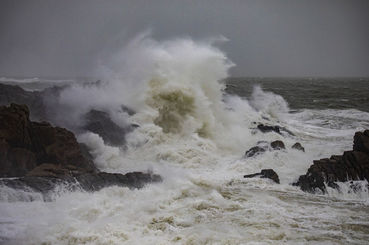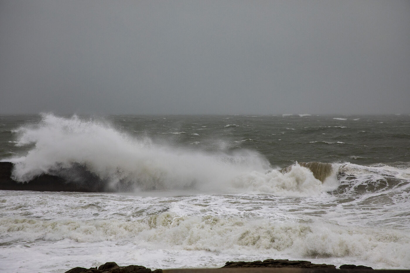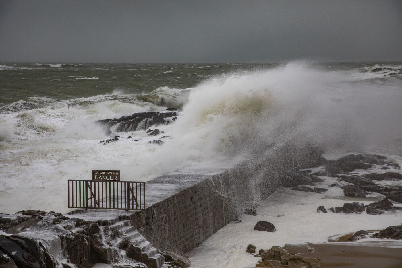 France, Batz-sur-Mer, January 2, 2024. With heavy swells, rain and strong winds, the west coast is experiencing a variety of storms, as in Loire-Atlantique, which has been placed under orange alert, particularly in Batz-sur-Mer and Le Croisic. Photography by Caroline Paux/Hans Lucas.
