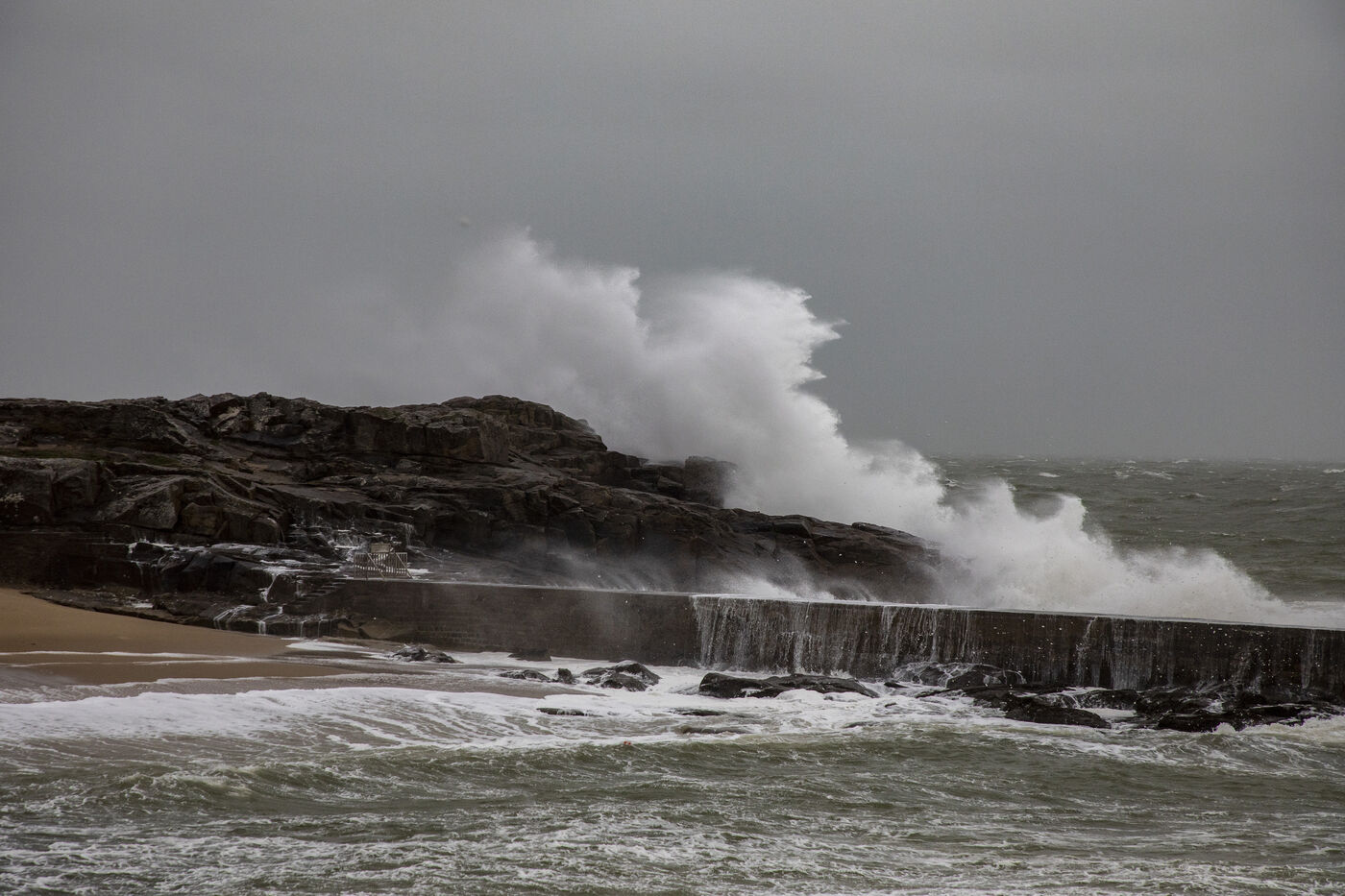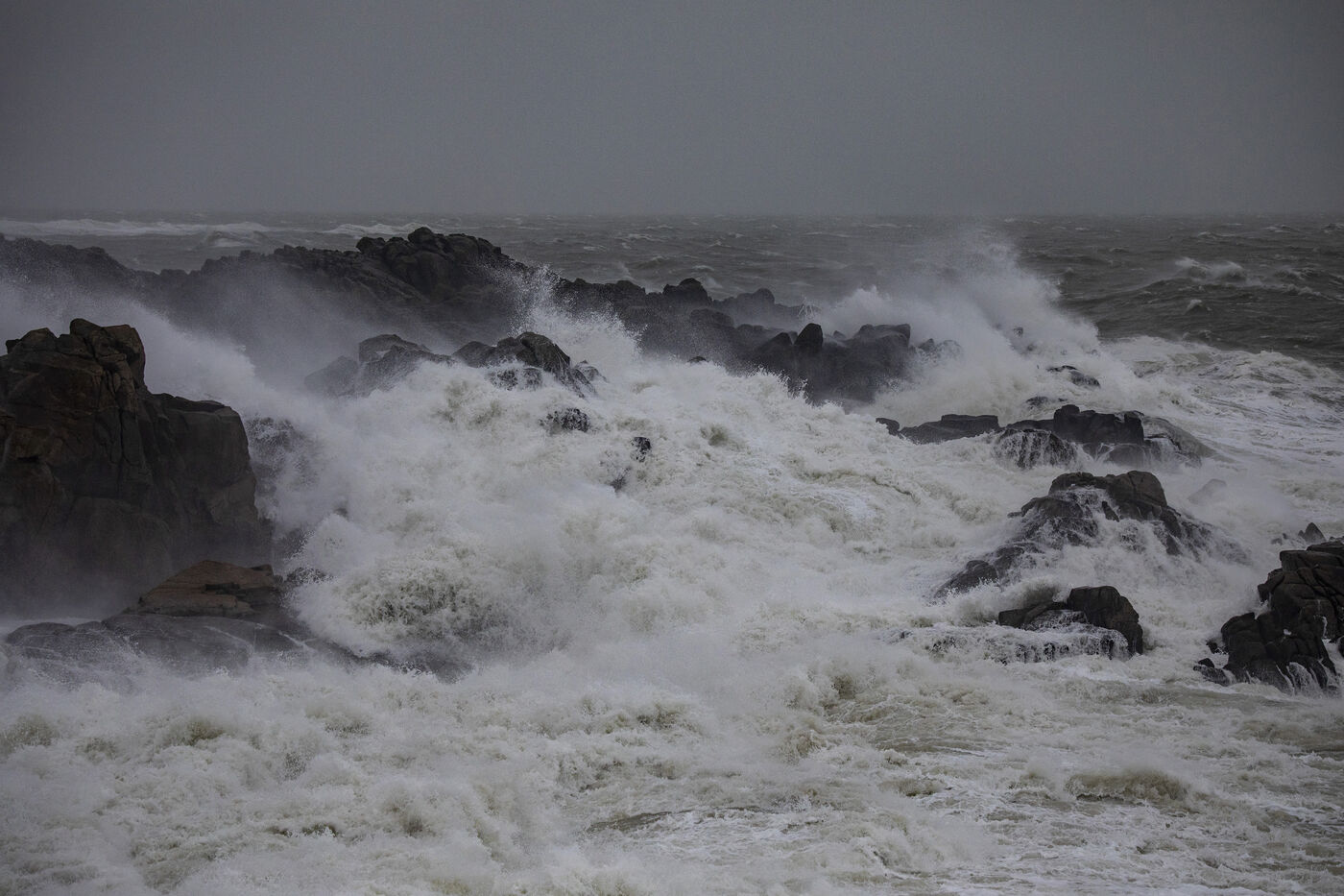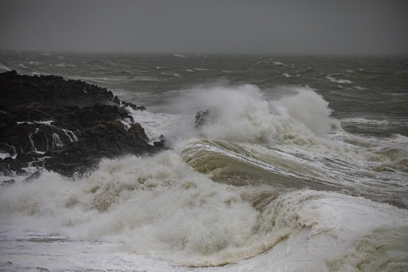 France, Batz-sur-Mer, 2 janvier 2024. Forte houle, pluie, vent fort, la côte Ouest subit différentes tempêtes, comme en Loire-Atlantique, placée en vigilance orange et notamment à Batz-sur-Mer et au Croisic. Photographie par Caroline Paux/Hans Lucas.