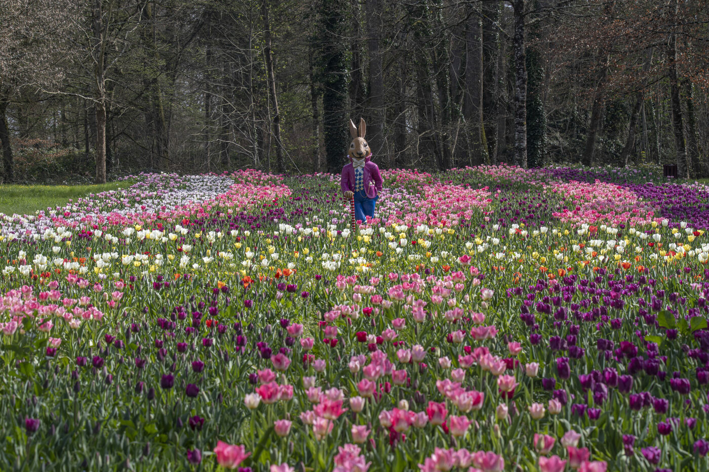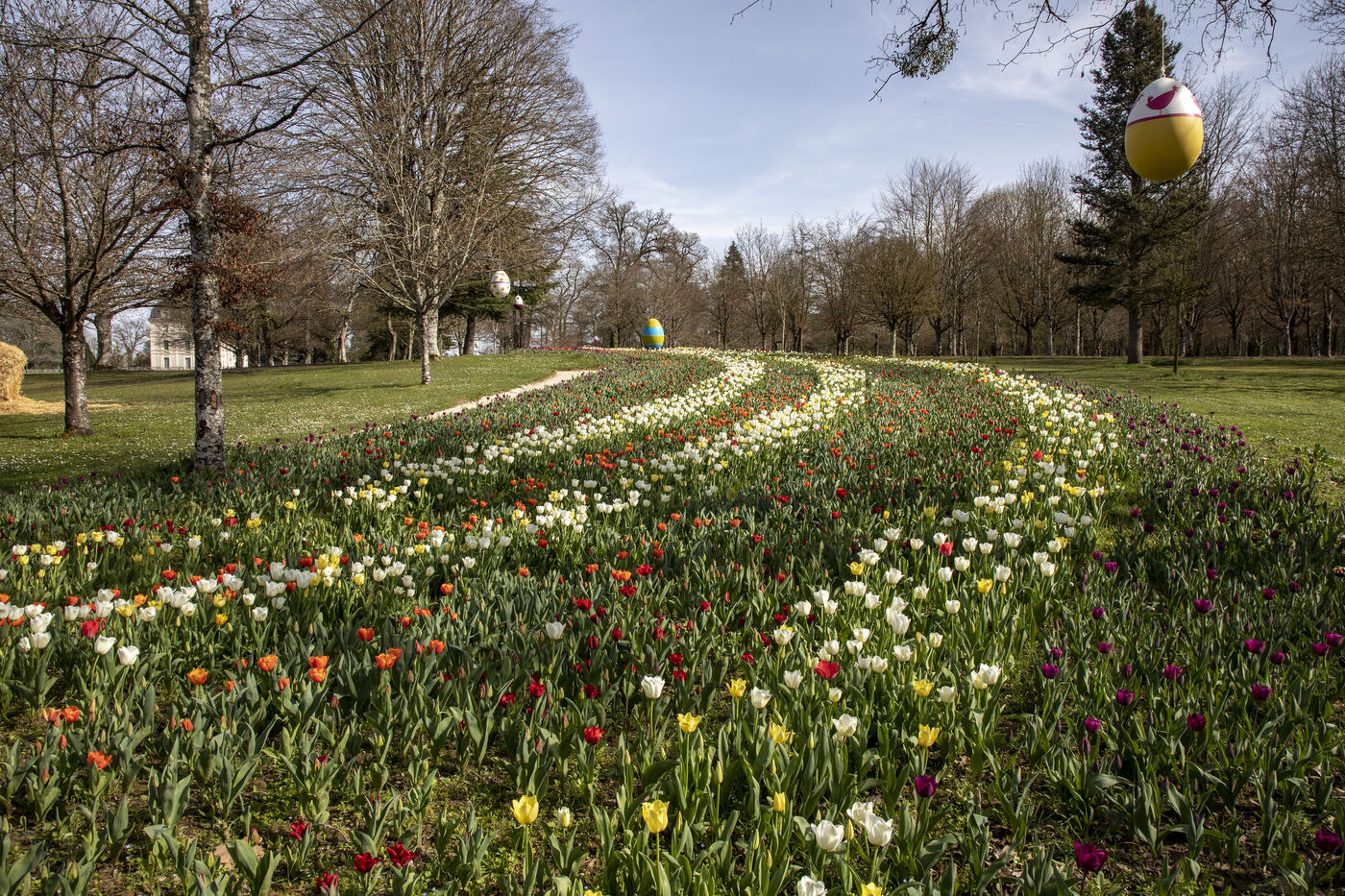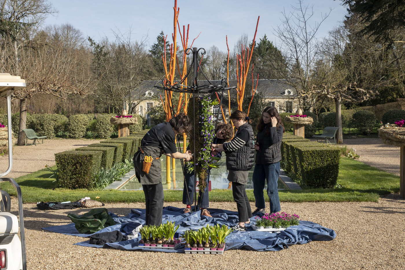 France, Cheverny, 21-03-2024. Dans le parc du Château de Cheverny, qui a inspiré Hergé, en 1942, pour Moulinsard, la propriété du capitaine Haddock, près d?un demi-million de tulipes ont été plantées. Pour Pâques, des élèves de l?école nationale des fleuristes Paris ont réalisé des créations florales inédites à l?extérieur et à l?intérieur du château. Photographie par Caroline Paux / Hans Lucas.