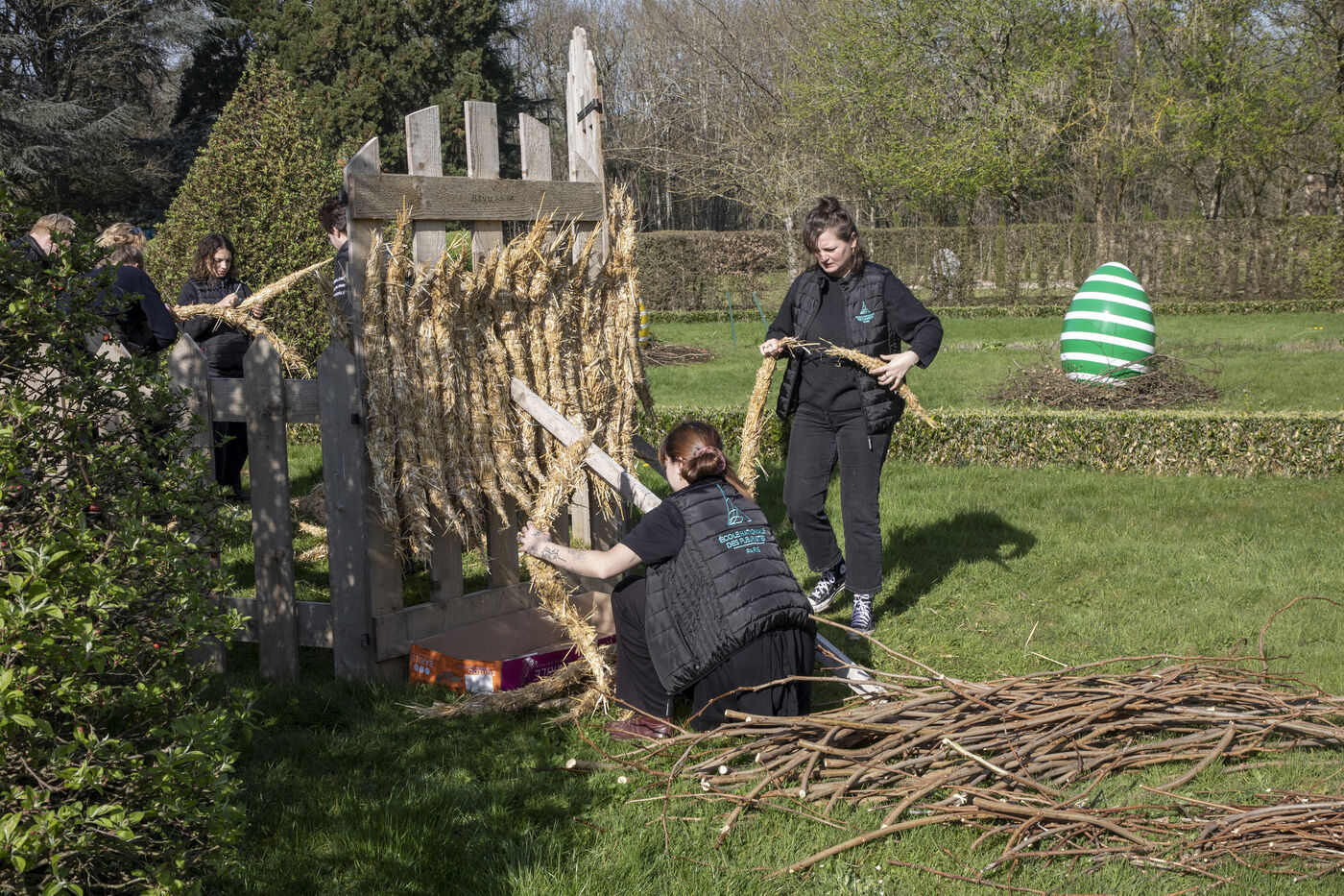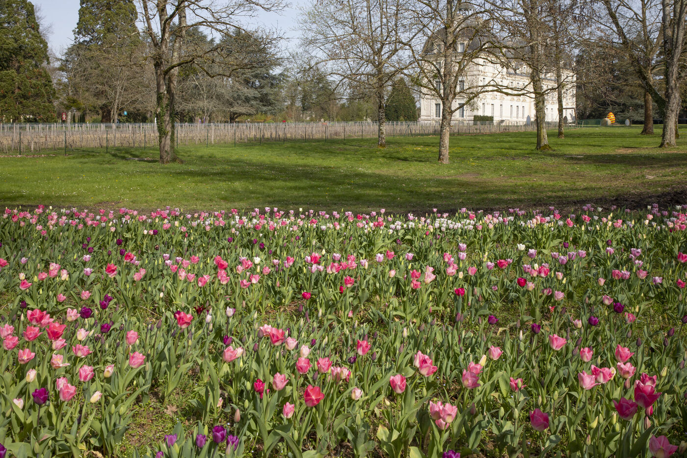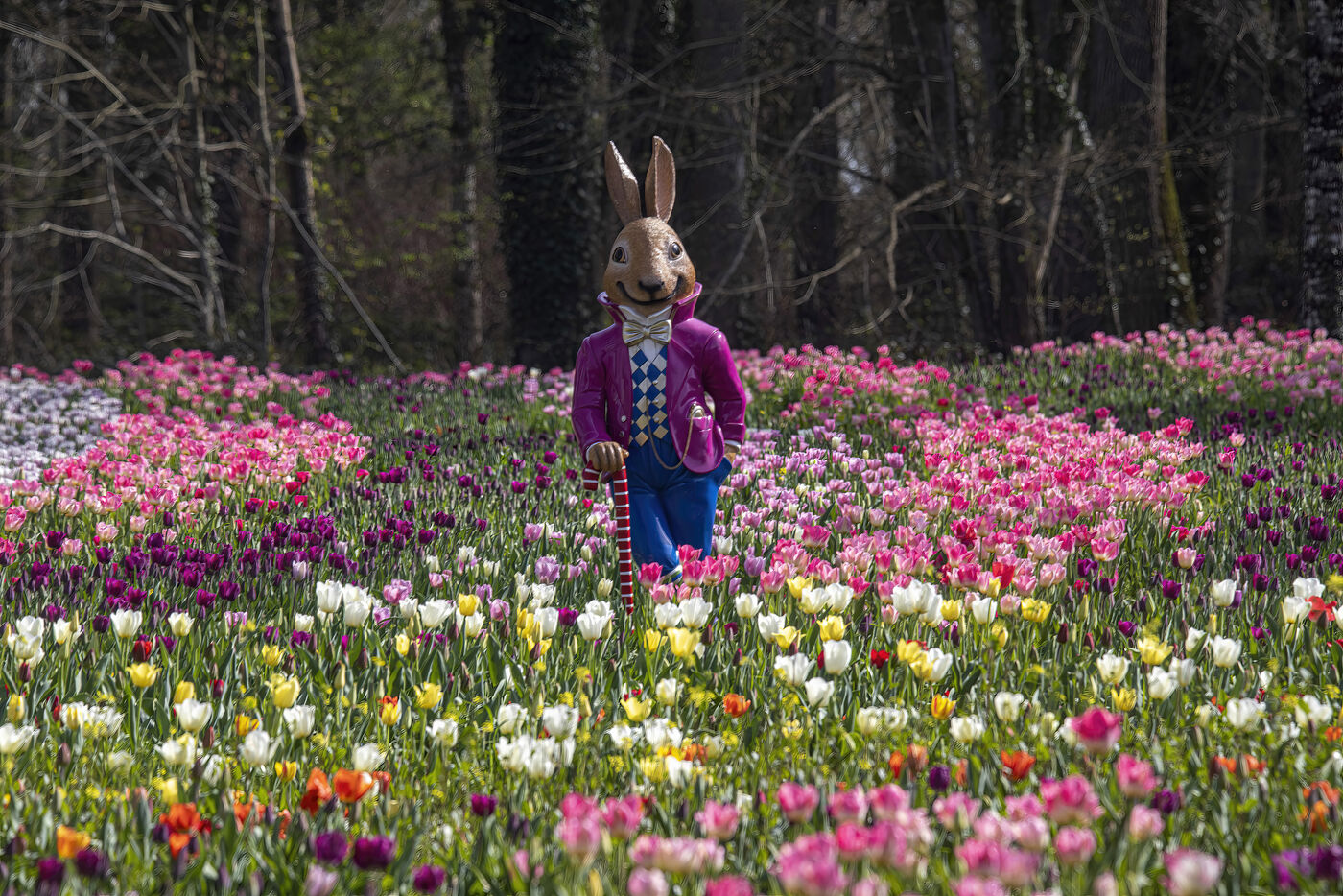 France, Cheverny, 21-03-2024. Dans le parc du Château de Cheverny, qui a inspiré Hergé, en 1942, pour Moulinsard, la propriété du capitaine Haddock, près d?un demi-million de tulipes ont été plantées. Pour Pâques, des élèves de l?école nationale des fleuristes Paris ont réalisé des créations florales inédites à l?extérieur et à l?intérieur du château. Photographie par Caroline Paux / Hans Lucas.