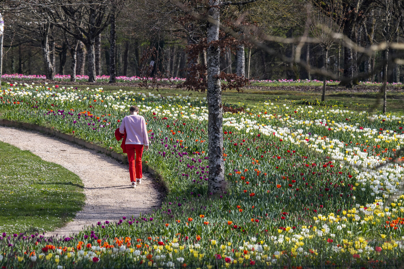 France, Cheverny, 21-03-2024. Nearly half a million tulips have been planted in the grounds of the Château de Cheverny, which in 1942 inspired Hergé to create Moulinsard, Captain Haddock's estate. For Easter, students from the Ecole Nationale des Fleuristes in Paris created new floral displays both inside and outside the château. Photography by Caroline Paux / Hans Lucas.