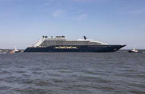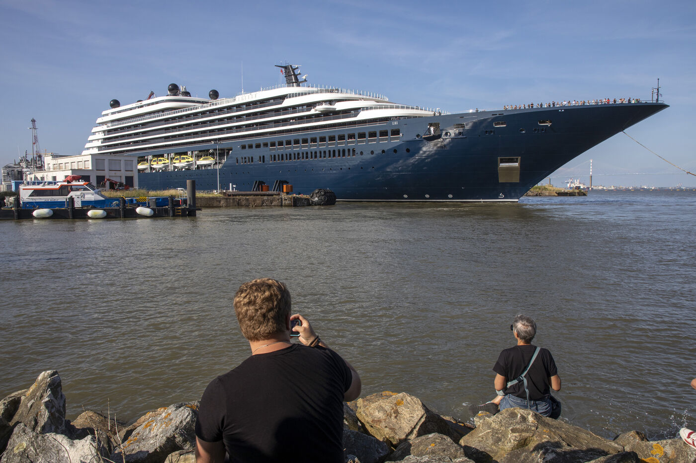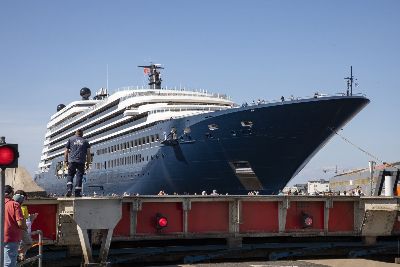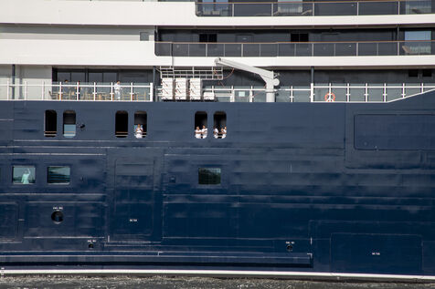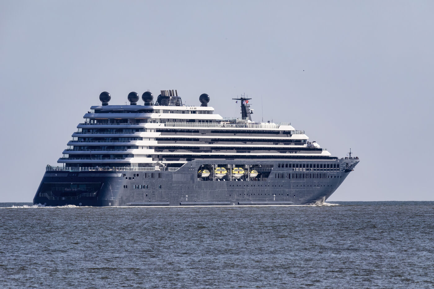 L'Ilma, un superyacht de luxe de 241 mètres de longueur, appartenant à la chaîne hôtelière Ritz-Carlton et construit par les Chantiers de l ? Atlantique, a quitte le port de Saint-Nazaire, mardi 23 juillet 2024. Ce paquebot de 224 suites de luxe avec vue sur mer est propulsé au gaz-fuel GNL. Après un voyage inaugural début septembre depuis Monte Carlo, l'Ilma tournera sur le bassin méditerranéen puis les Caraïbes et en Europe du Nord à l'été 2025. Photographie par Caroline Paux / Hans Lucas