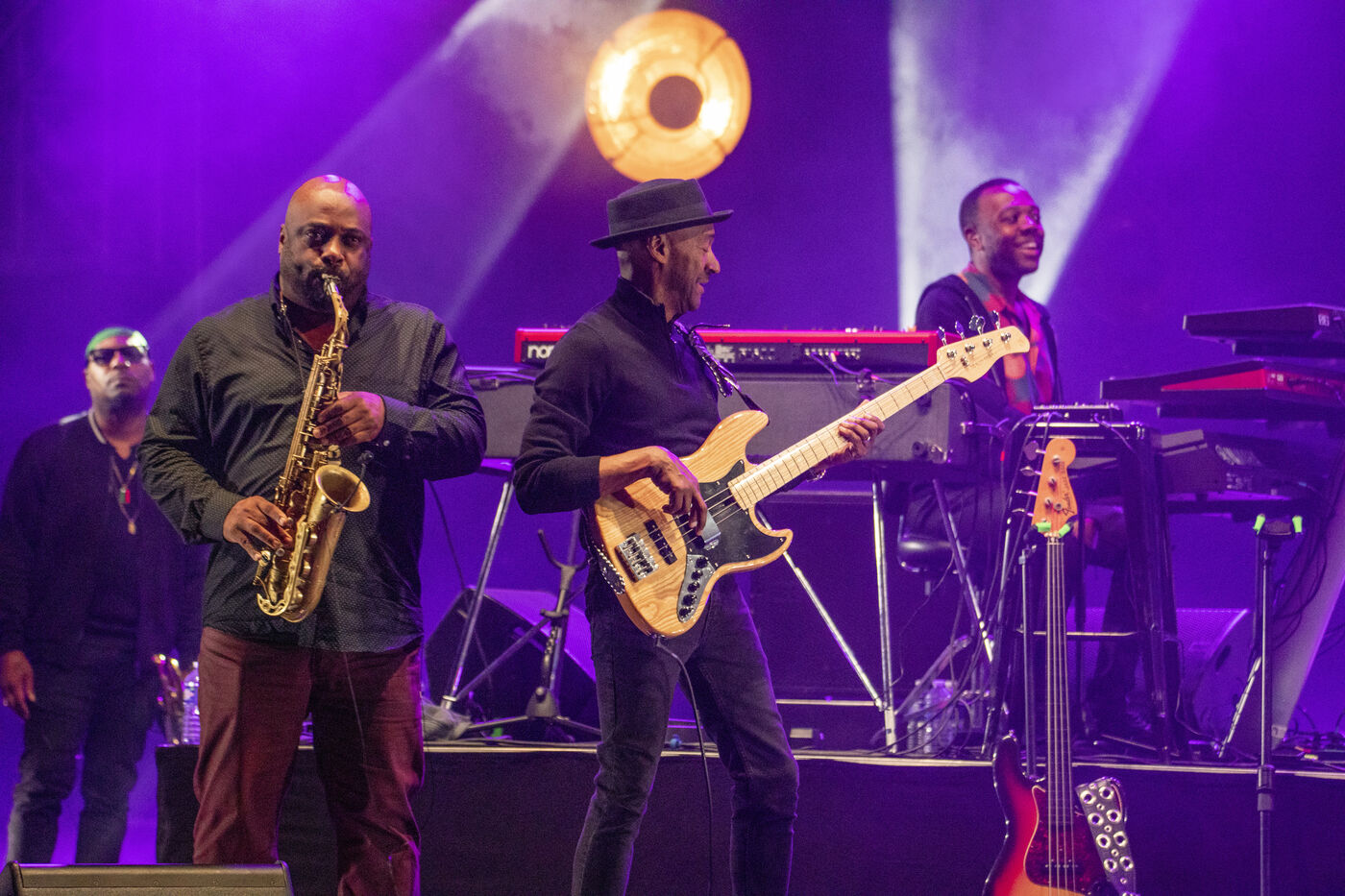 Evenement à La Baule avec le concert de la figure iconique du jazz, le légendaire bassiste de Miles Davis, Marcus Miller et ses musiciens, pour la clôture du La Baule Jazz festival au Parc des Dryades, vendredi 2 août 2024.