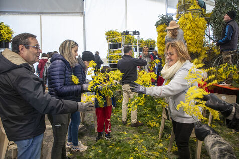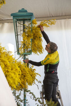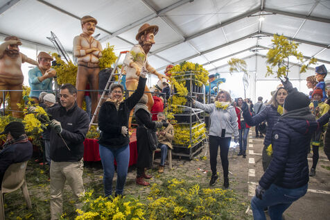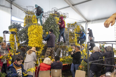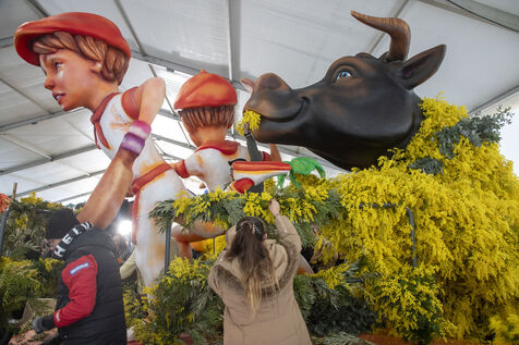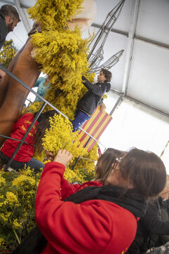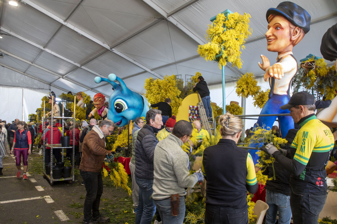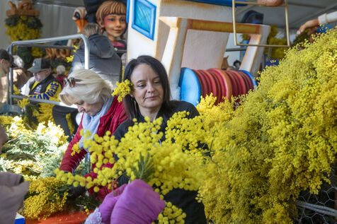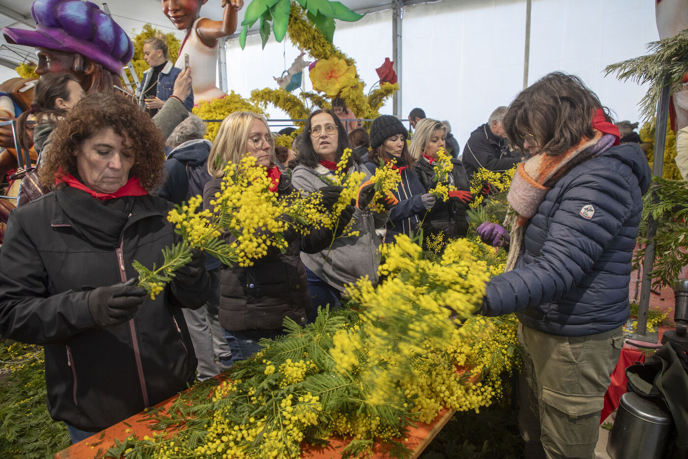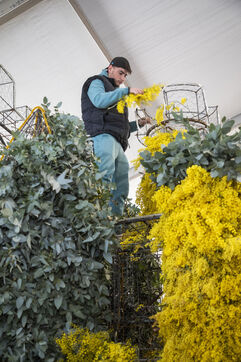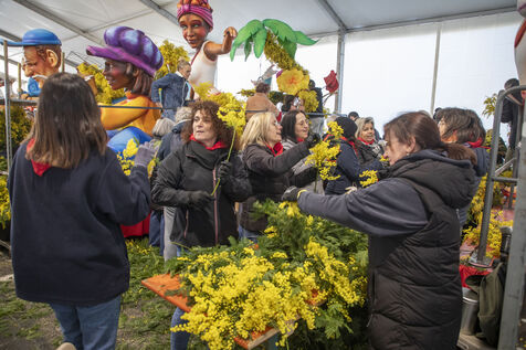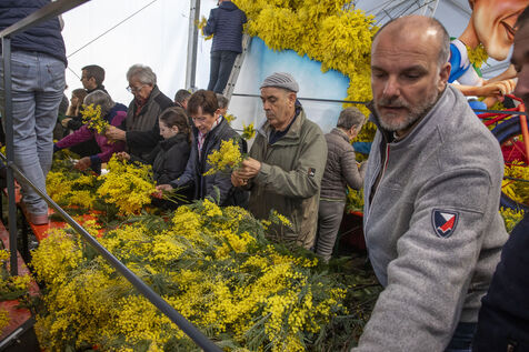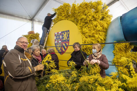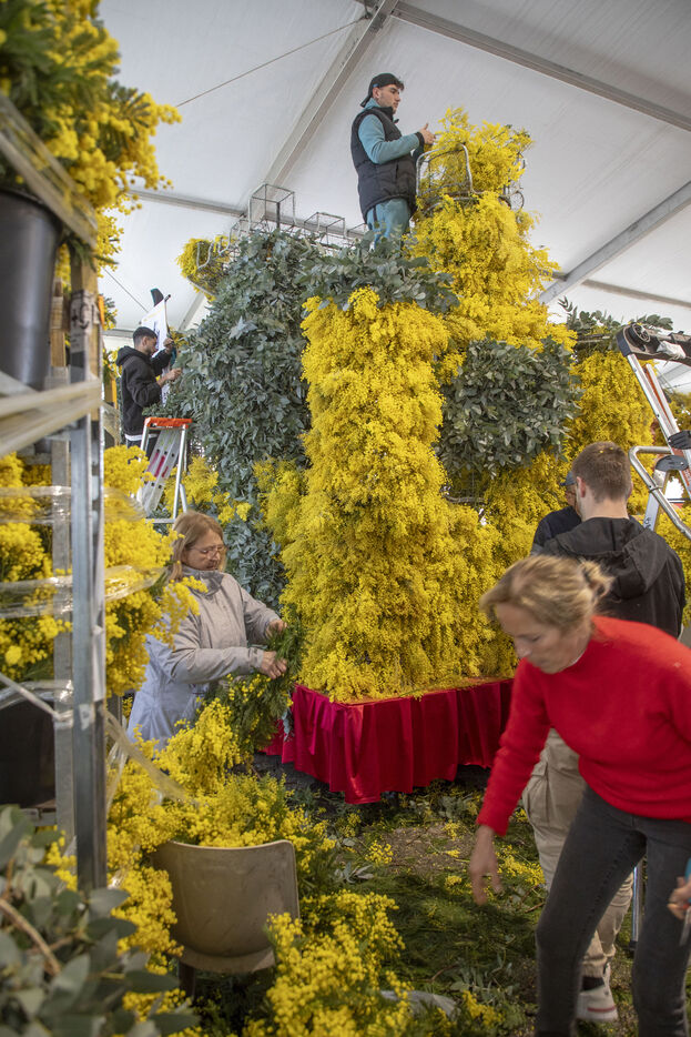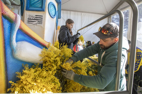 500 bénévoles ont préparé les douze chars du Corso fleuri en les couvrant de mimosa fraichement cueillis, à Mandelieu-la-Napoule, France, samedi 15 février 2025. Les chars ont participé a une parade nocturne le soir même et au grand corso et la bataille fleurie le lendemain près du port de Mandelieu devant plus de 45 000 spectateurs. Photographie par Caroline Paux / Hans Lucas