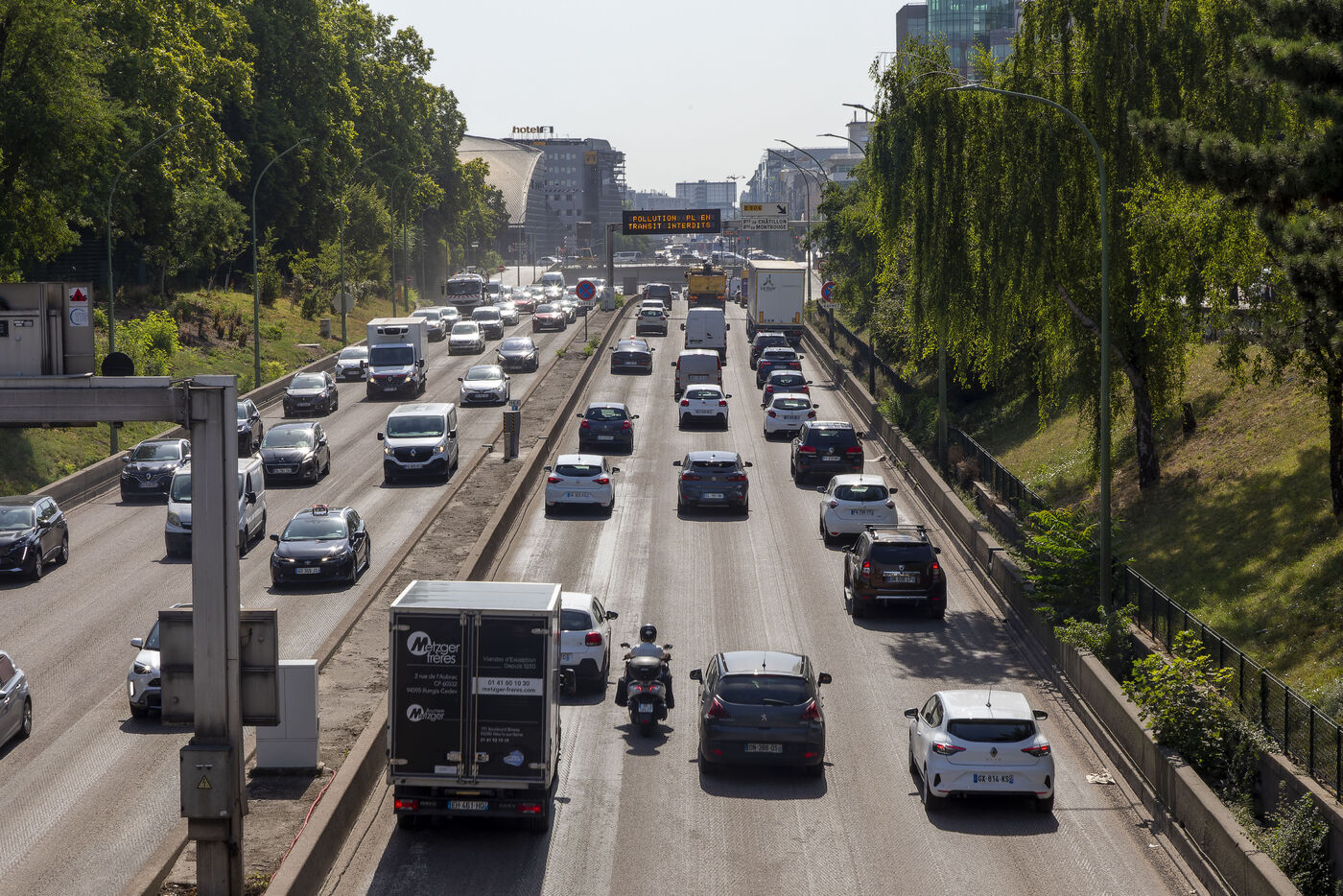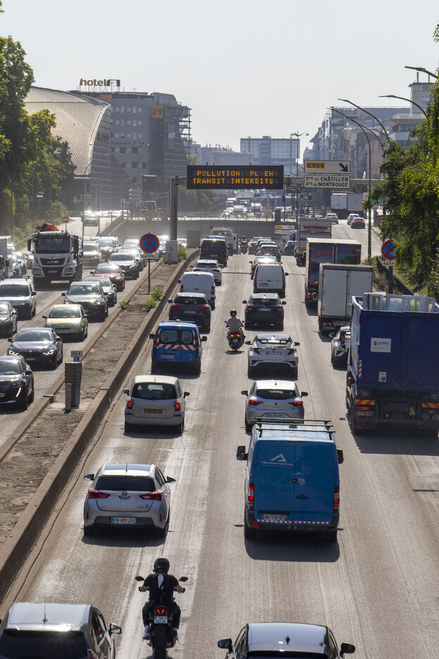 Very heavy traffic and a ban on heavy goods vehicles in transit due to pollution on the Paris ring road in France on 2 July 2025. Due to the heatwave and heavy ozone pollution in the Ile-de-France region, traffic restrictions have been imposed by the Paris Prefecture. Photography par Caroline Paux / Hans Lucas