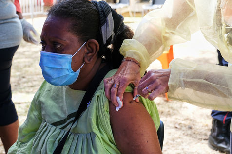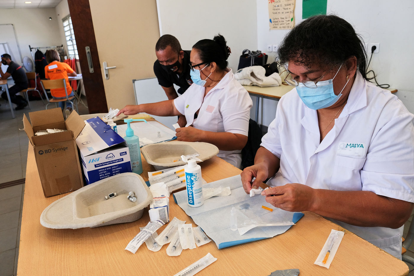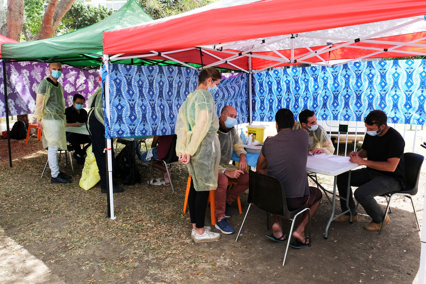Nouméa, Nouvelle-Calédonie, 2021-09-24. Un centre de vaccination contre la COVID-19 est mis en place aux abords des Tours Magenta au nord-est de la ville de Nouméa. Depuis quelques semaines la Nouvelle-Calédonie a perdu son statut de covid-free et le virus progresse rapidement à travers le territoire. Le gouvernement de la Nouvelle-Calédonie a mis en place une campagne de vaccination intense, dans les villes et en brousse, pour qu'un maximum de personnes se vaccinent contre la Covid-19.