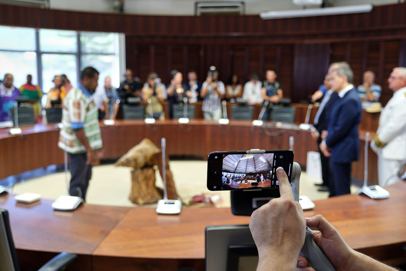 Lors de leur premier visite officielle conjointe en Nouvelle-Calédonie, le Ministre de l'Intérieur et des Outre-Mer Gérald Darmanin et le Ministre délégué chargé des Outre-Mer Jean-François Carenco effectuent un dépot de gerbe Place Bir-Hakeim à Nouméa, et effectuent ensuite une coutume de bienvenue au Sénat Coutumier.