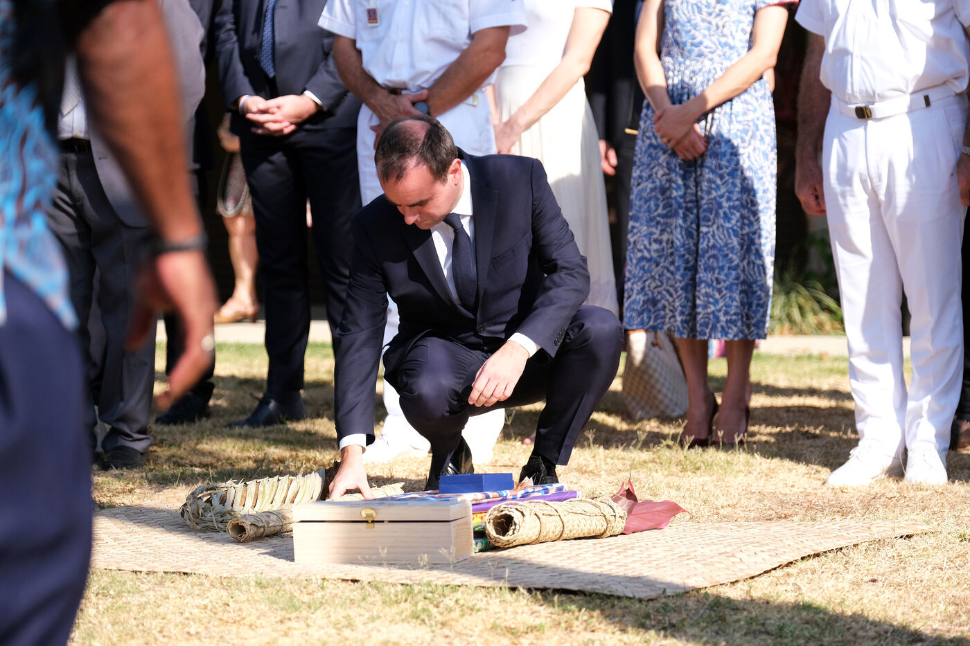 The French Minister of the Armed Forces Sebastien Lecornu execute a custom at the senat coutumier in Noumea upon his arrival in the city for a 5 days visit.