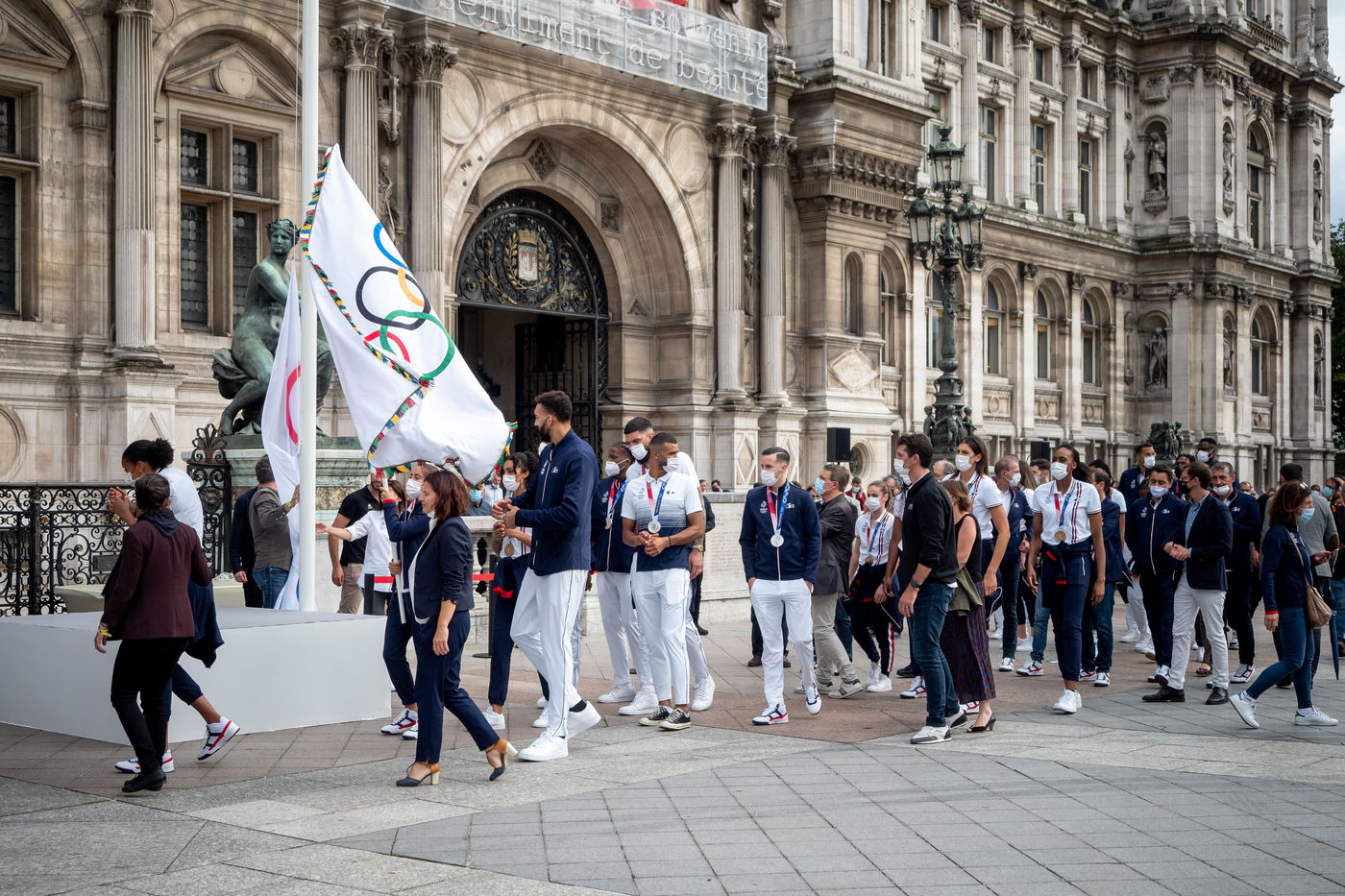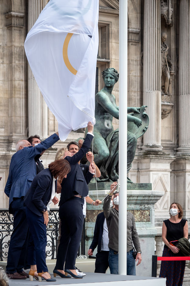 La délégation olympique française de retour de Tokyo avec la Maire de Paris Annne Hidalgo, hisse le drapeau olympique pour Paris2024.