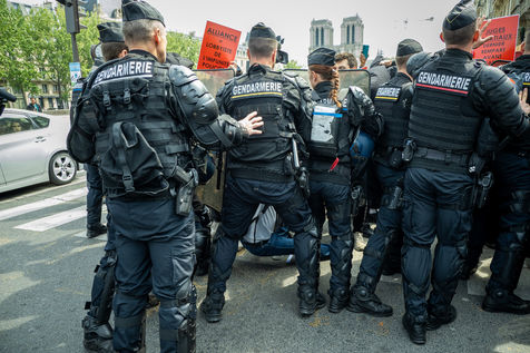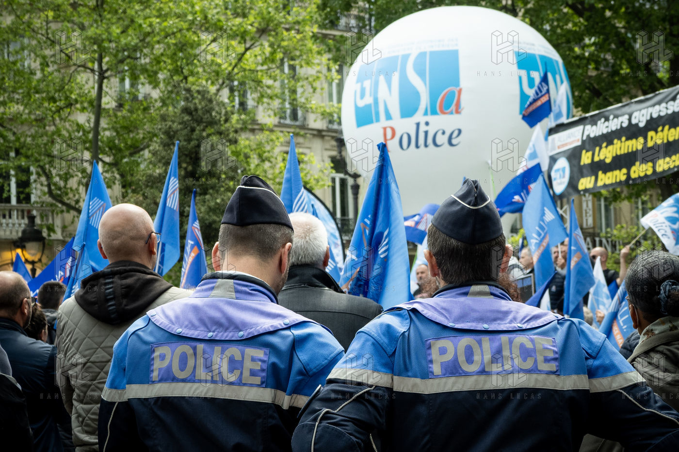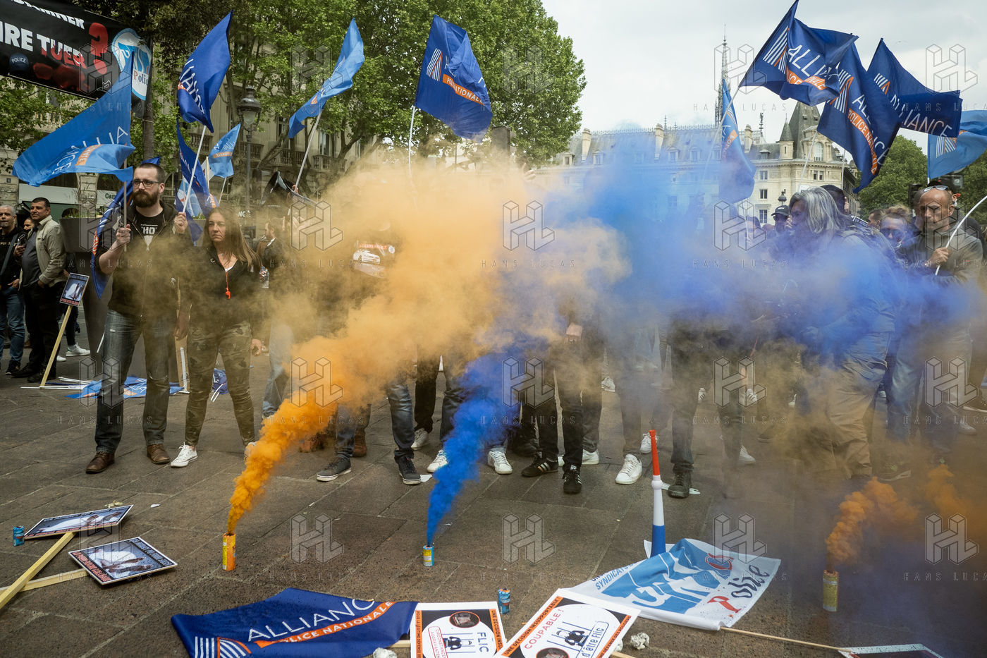 Rally called by police union to protest against the indictment for voluntary manslaughter of their colleague implicated in the death of two people on the Pont Neuf on April 24. On the opposite sidewalk a counter-demonstration quickly channeled.