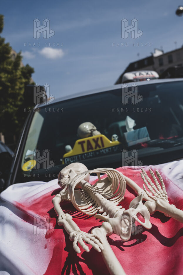 Les chauffeurs de taxis manifestent à nouveau en bloquant des rues et avenues devant Bercy, le ministère de l'économie pour protester contre la nouvelle convention de la CNAM.