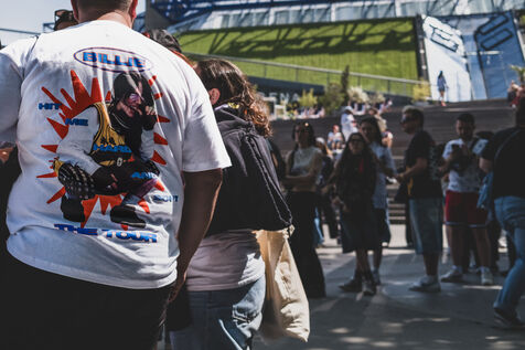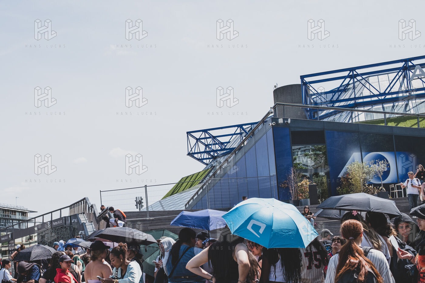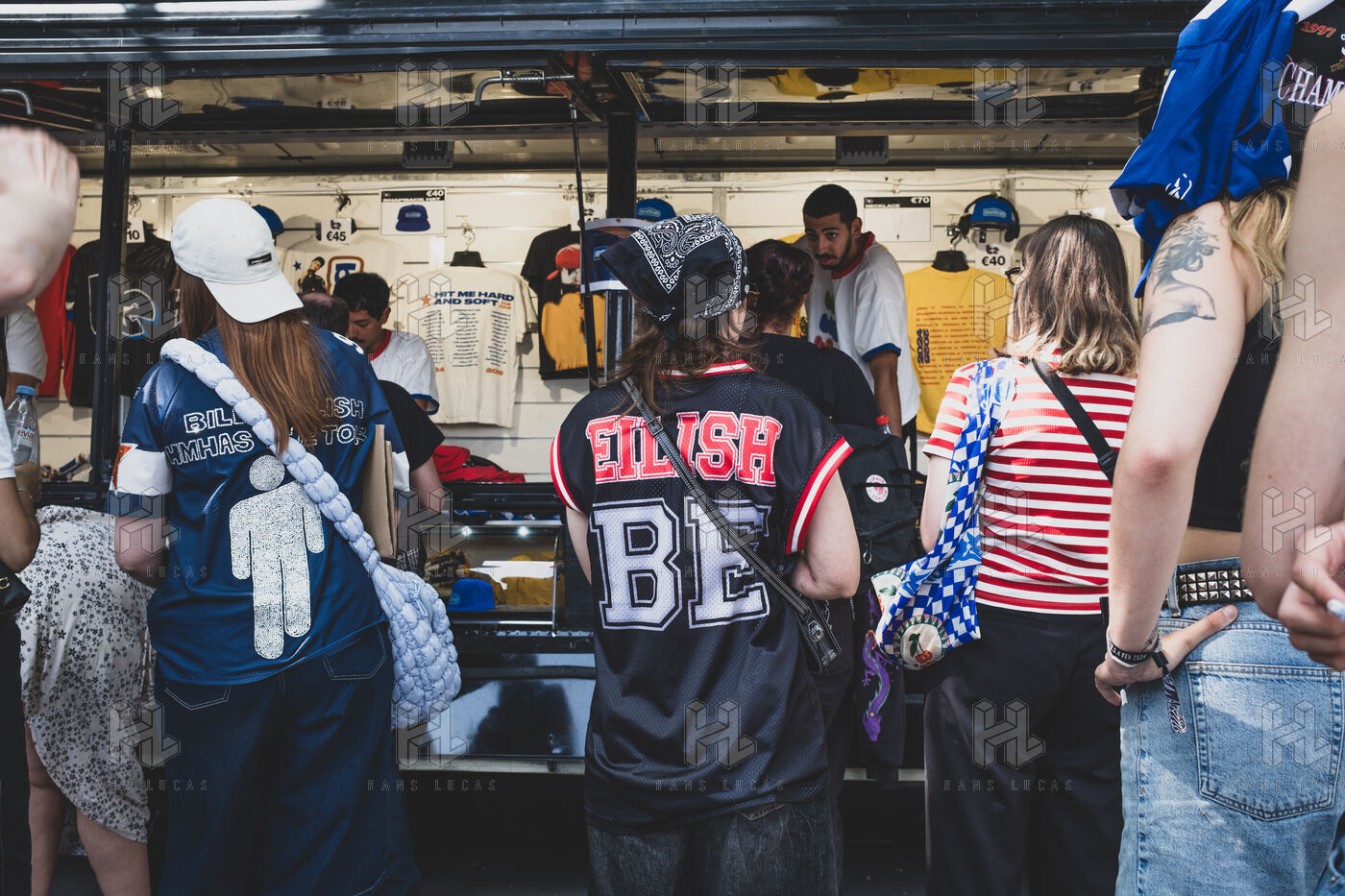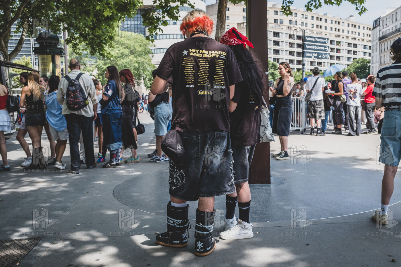 Illustration of Billie Eilish fans gathered in front of the Accor Arena Bercy in Paris on June 11, 2025, prior to her concert. Outfits inspired by or bearing the artist's likeness await one of the biggest musical events of the year.