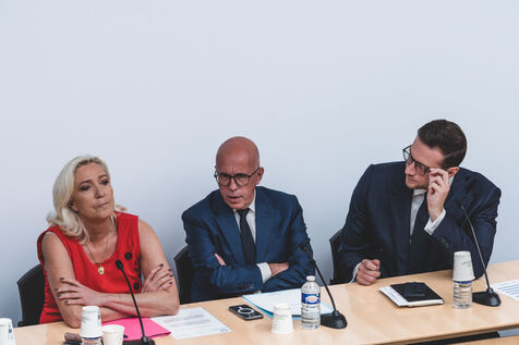 Agreement of the National Union, Rassemblement National and Union des Droites with Marine Le Pen, Jordan Bardella and Eric Ciotti at the National Assembly.