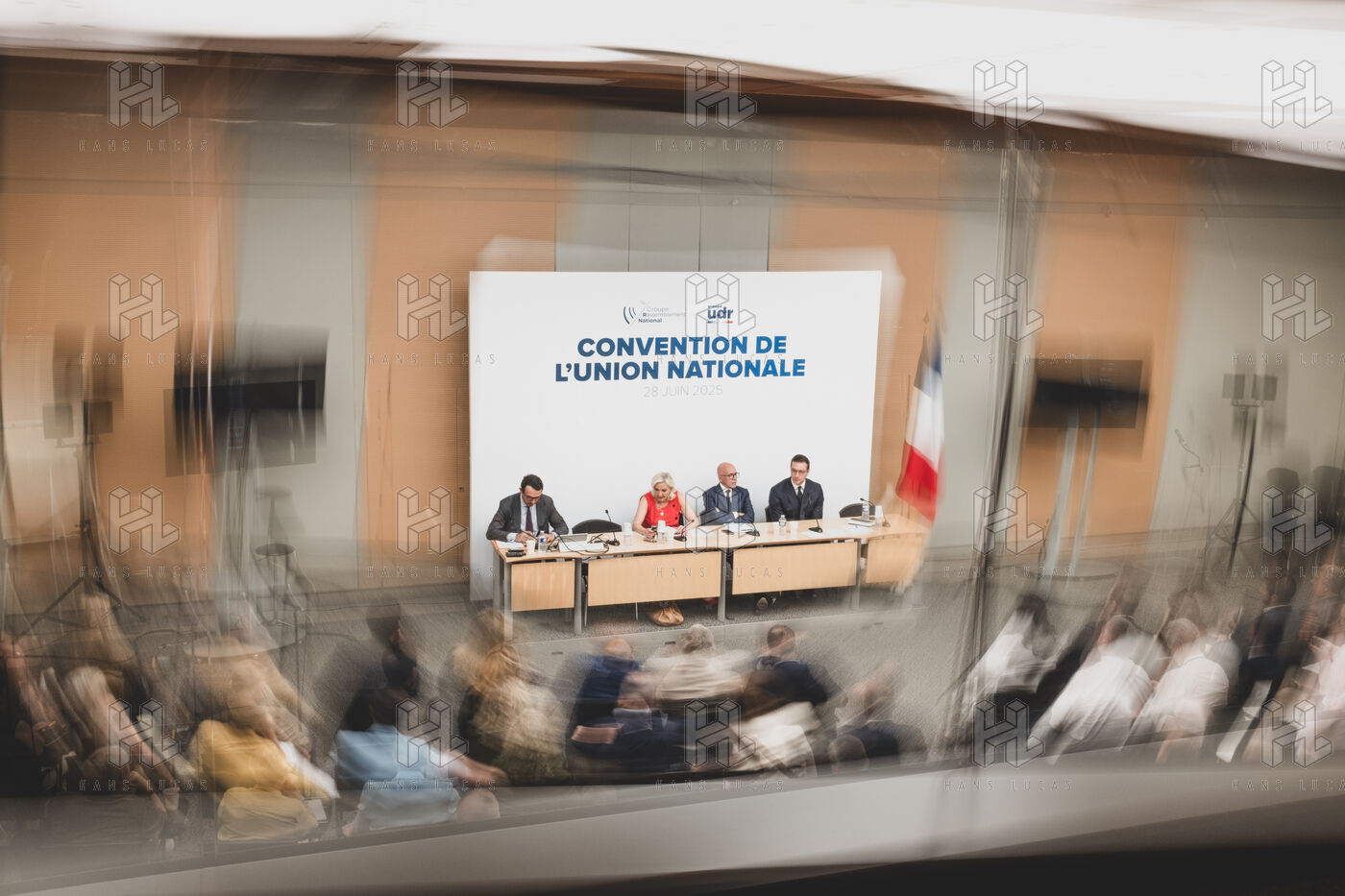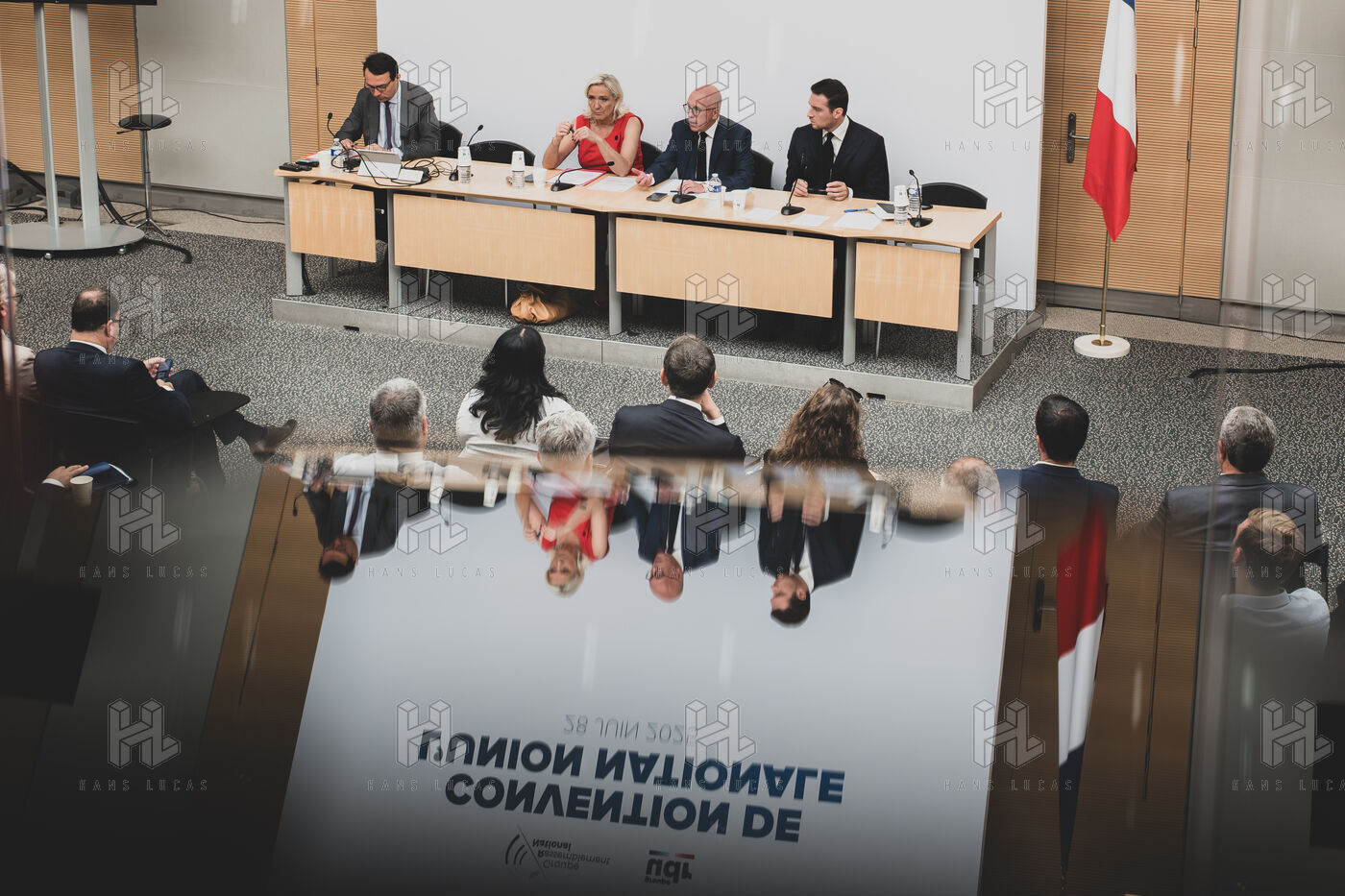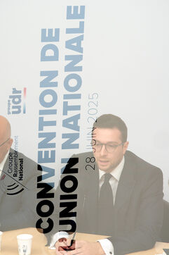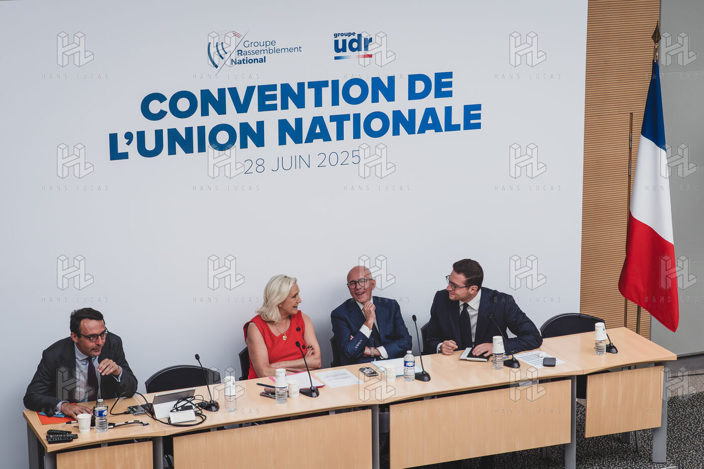 Convention de l'union nationale, Rassemblement National, RN et Union des Droites, UDR avec Marine Le Pen, Jordan Bardella et Eric Ciotti à l'Assemblée Nationale.