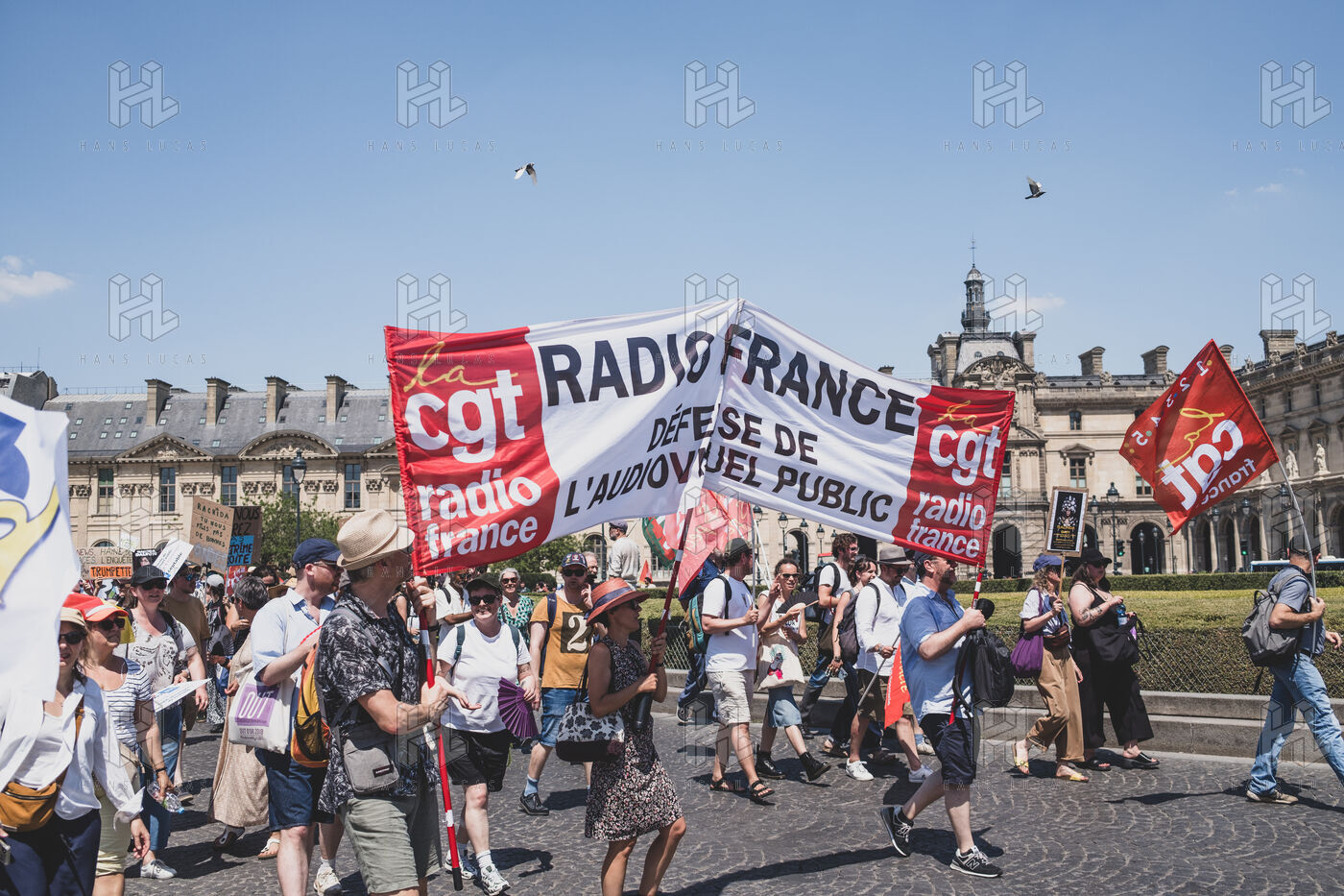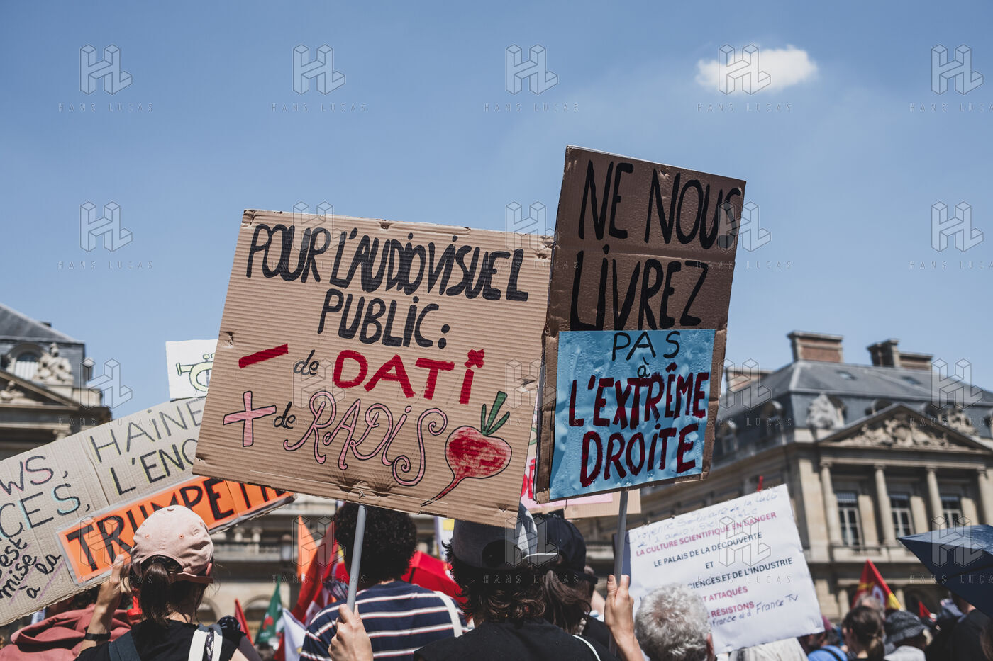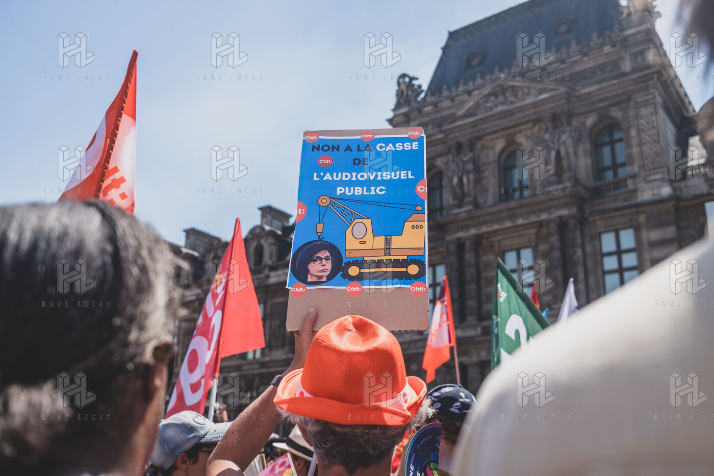 Manifestation contre le projet de loi actant la création d’une holding rassemblant France Télévisions, Radio France et l’INA porté par la Ministre de la culture Rachida Dati.
