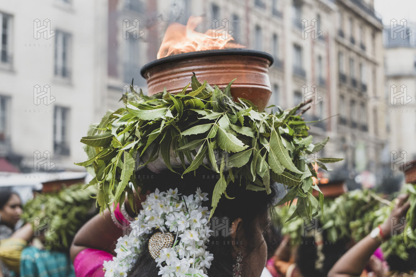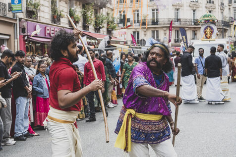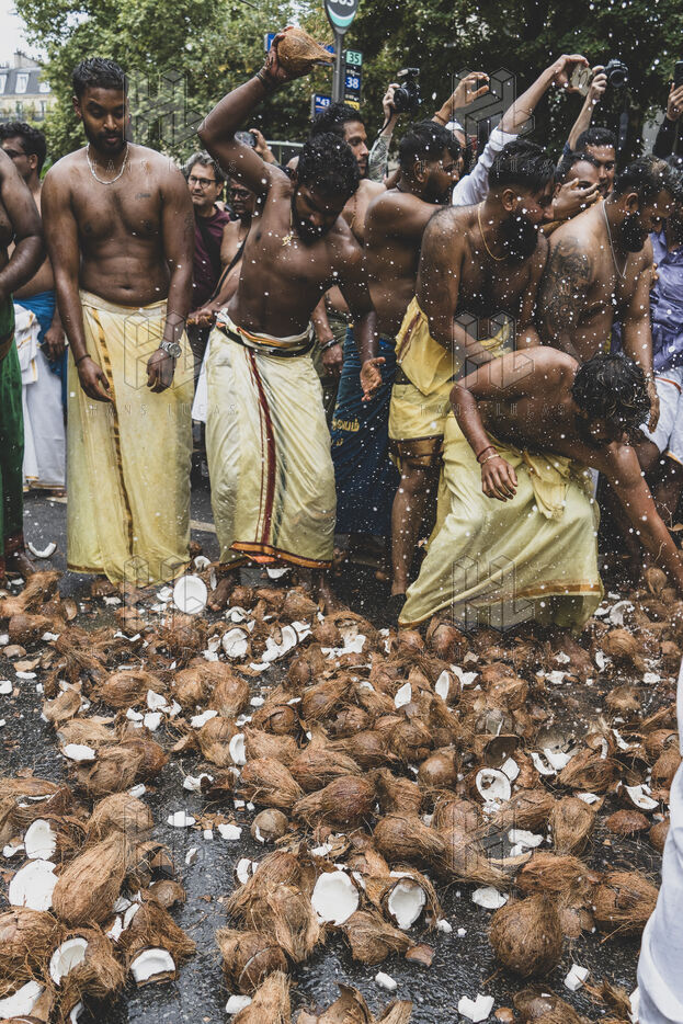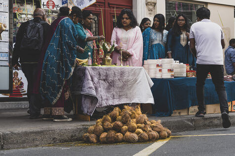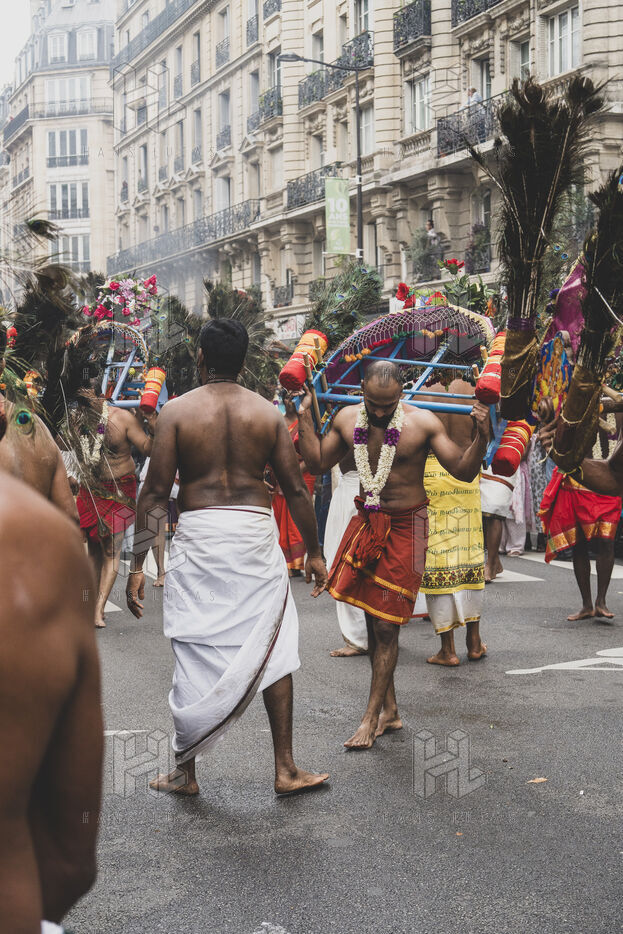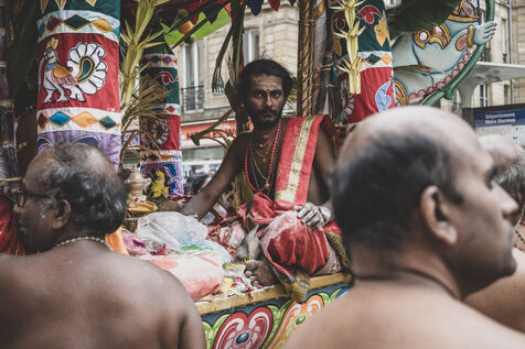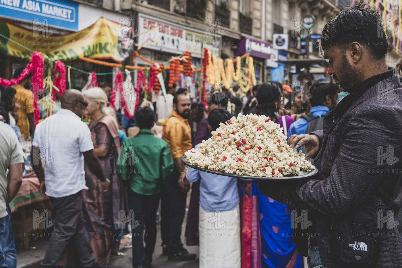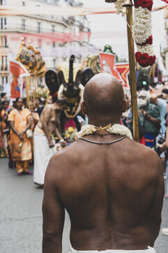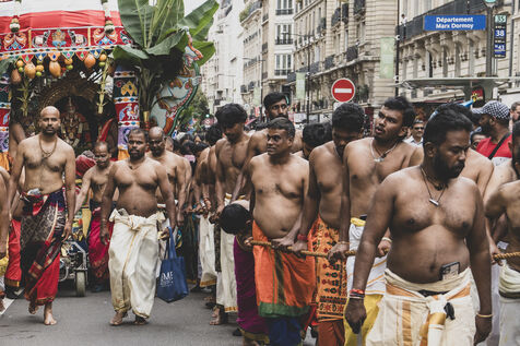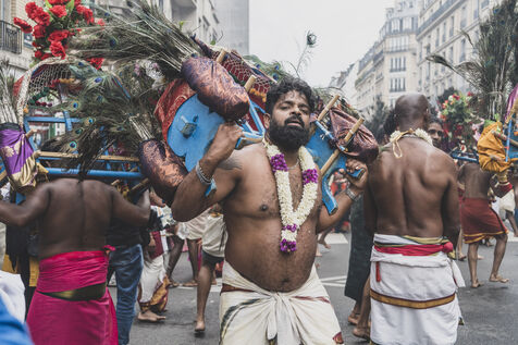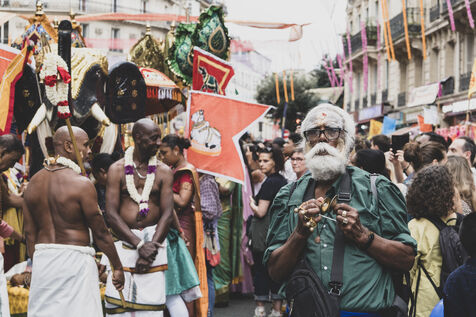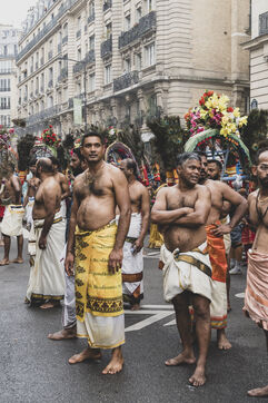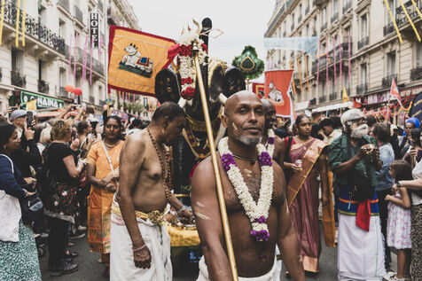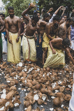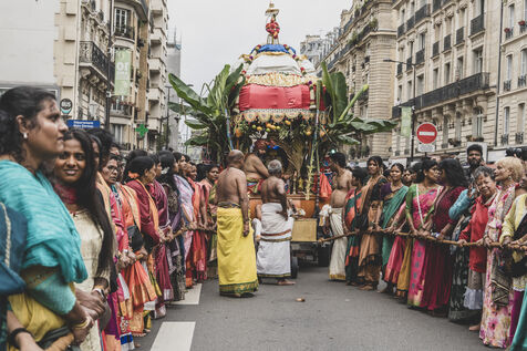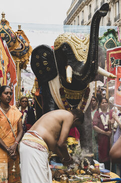 It is around the Sri Manicka Vinayakar Alayam temple located in the 18th arrondissement of Paris, that Ganesh is celebrated every year in the capital. During this day of celebration, religious ceremonies and a procession take place in the streets of the neighborhood. During this religious parade, coconuts are broken: the shell represents the illusion of the world, the flesh represents individual karma, and the coconut water represents the ego. This water is poured as the representation of Ganesha passes by. Next come the dancers, who carry large peacock feather arches called kavadi on their shoulders, and the female dancers, who carry terracotta pots with burning camphor on their heads.