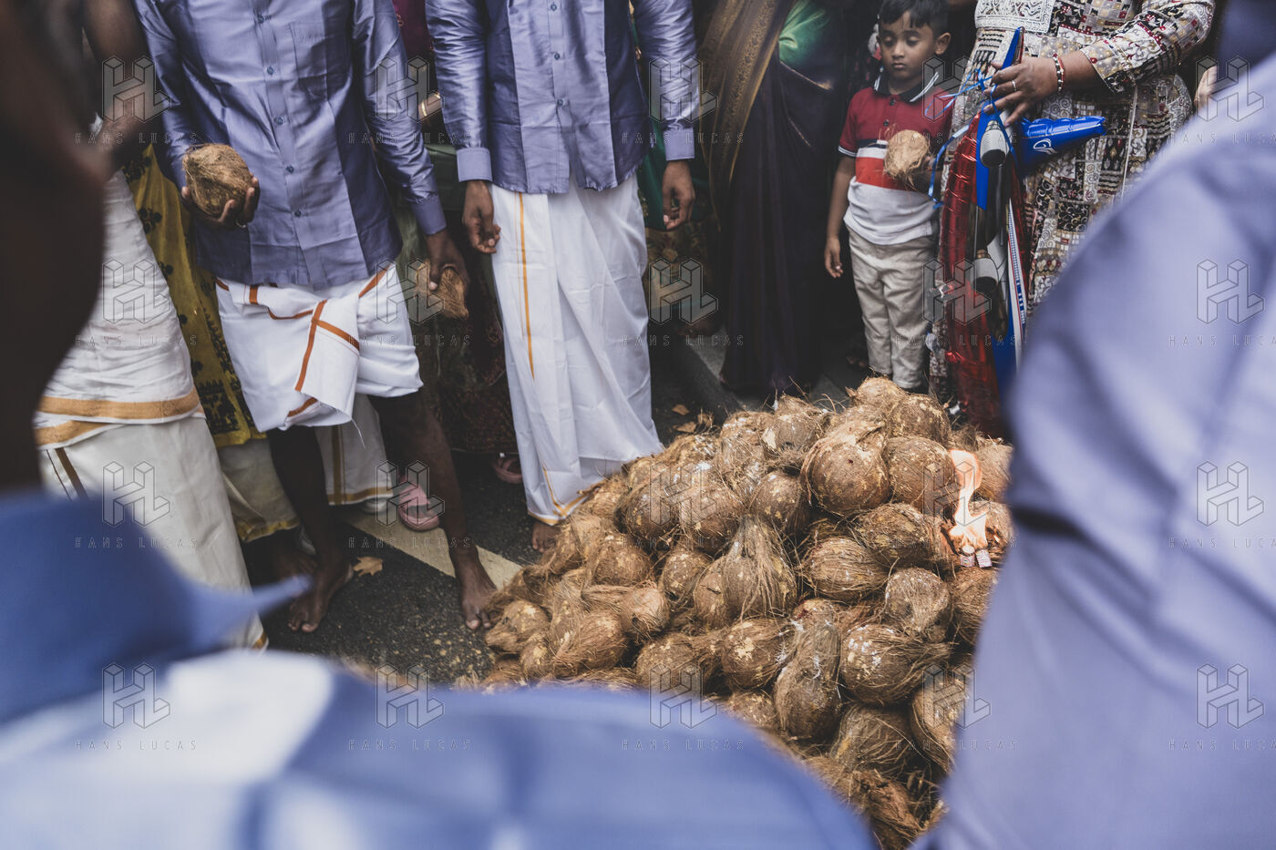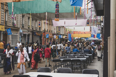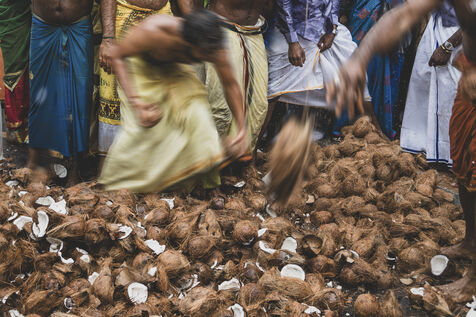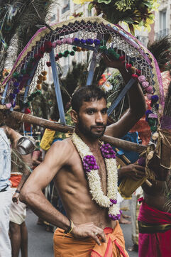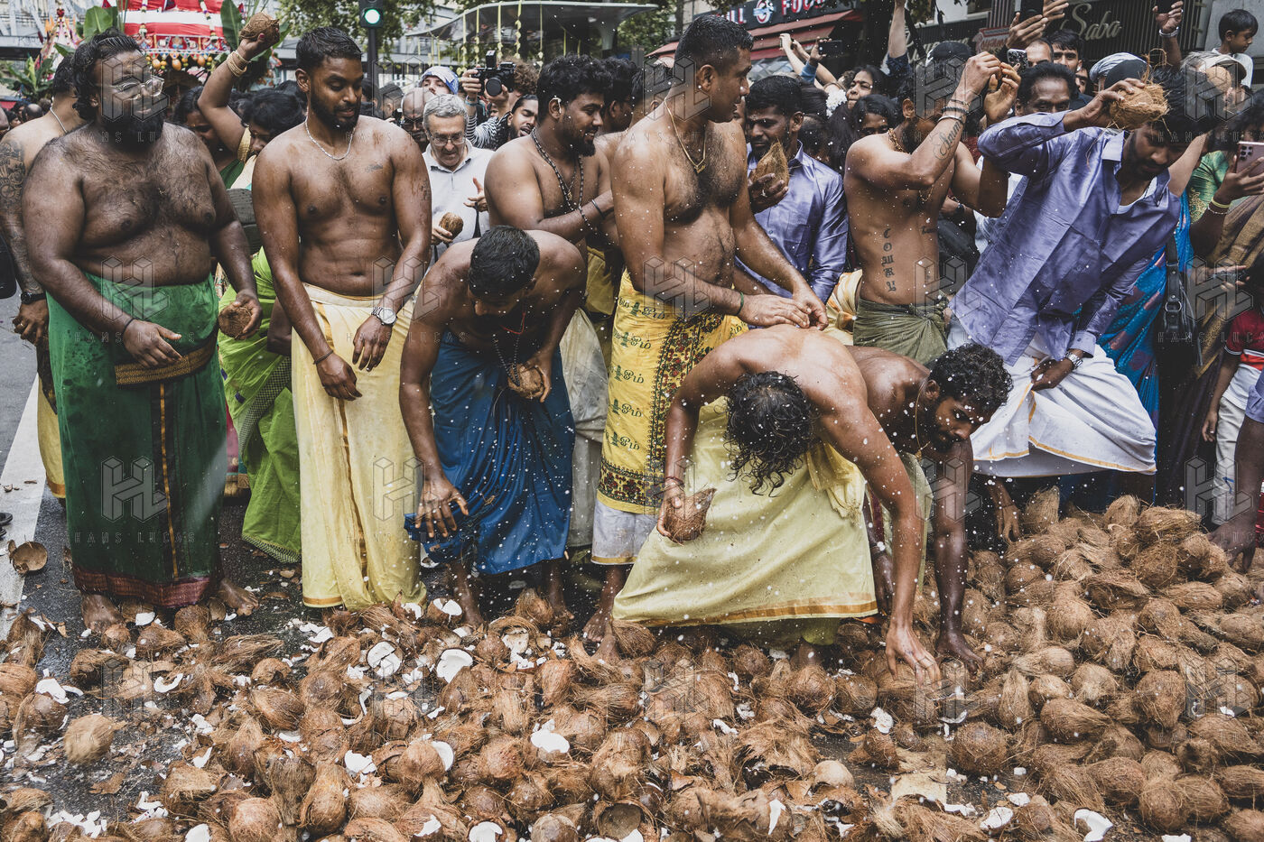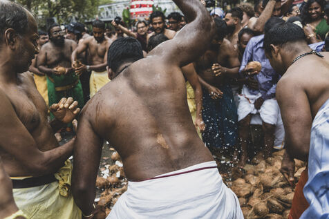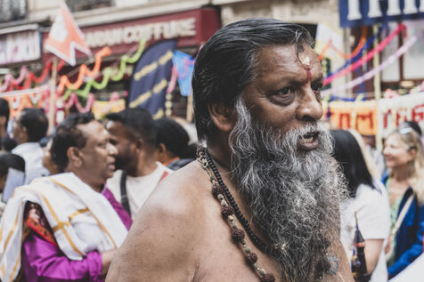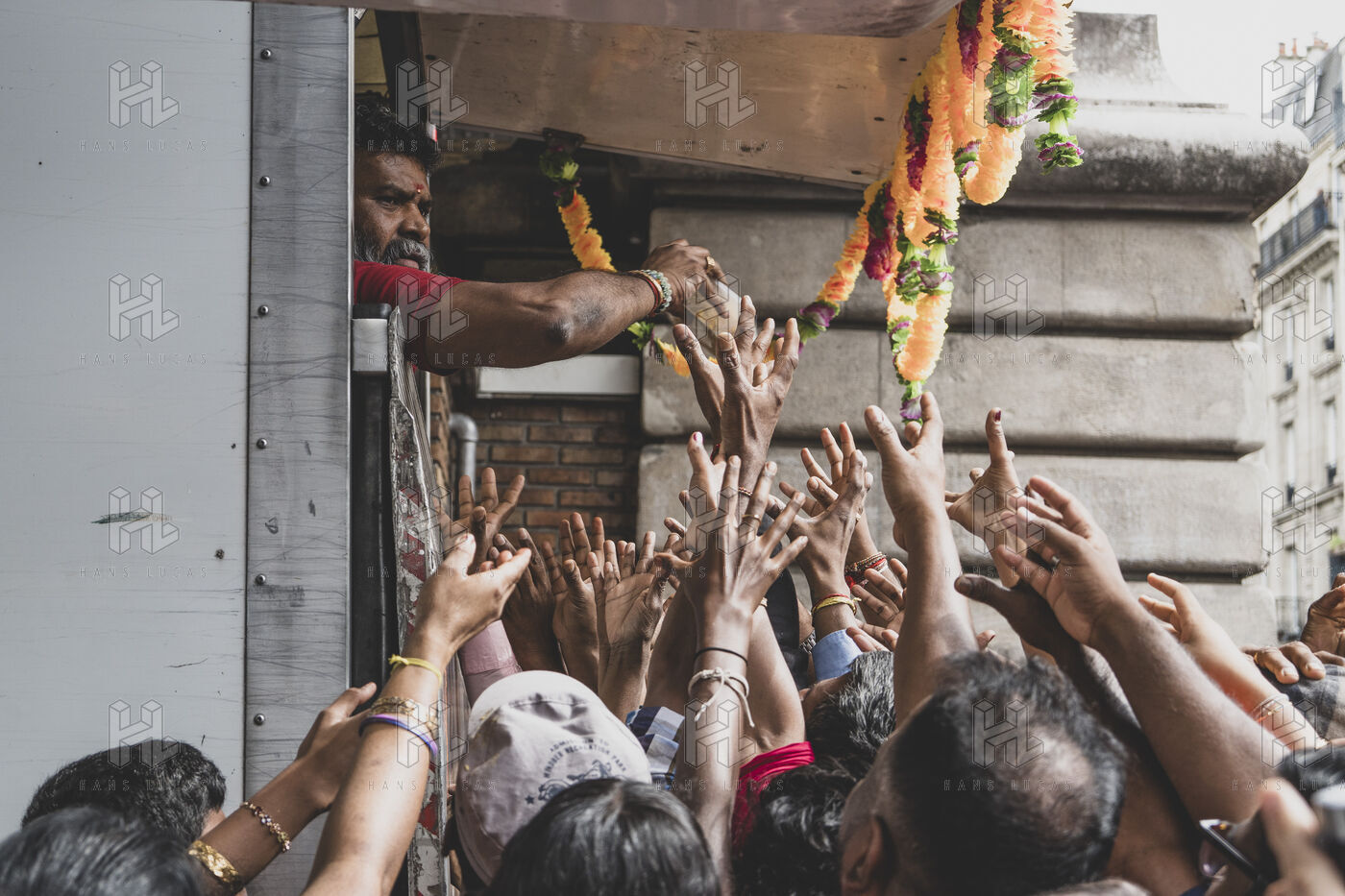It is around the Sri Manicka Vinayakar Alayam temple located in the 18th arrondissement of Paris, that Ganesh is celebrated every year in the capital. During this day of celebration, religious ceremonies and a procession take place in the streets of the neighborhood. During this religious parade, coconuts are broken: the shell represents the illusion of the world, the flesh represents individual karma, and the coconut water represents the ego. This water is poured as the representation of Ganesha passes by. Next come the dancers, who carry large peacock feather arches called kavadi on their shoulders, and the female dancers, who carry terracotta pots with burning camphor on their heads.