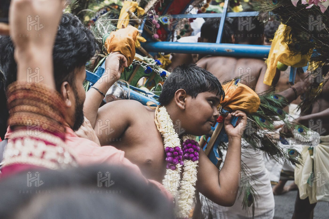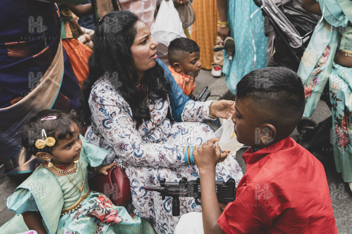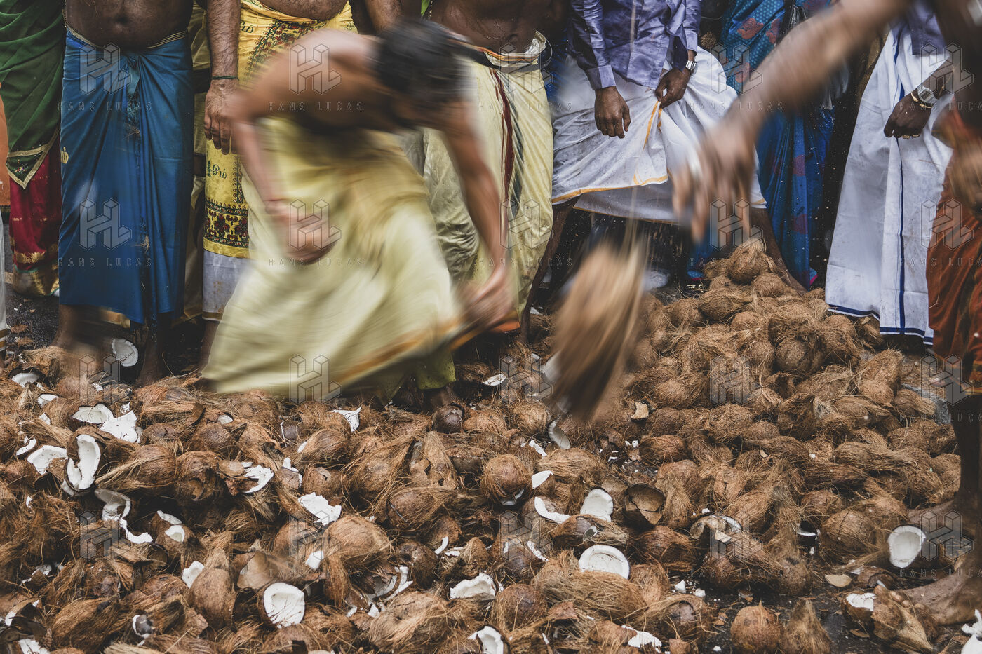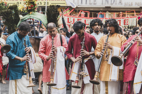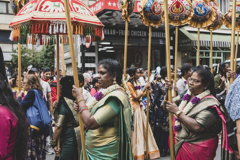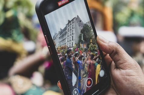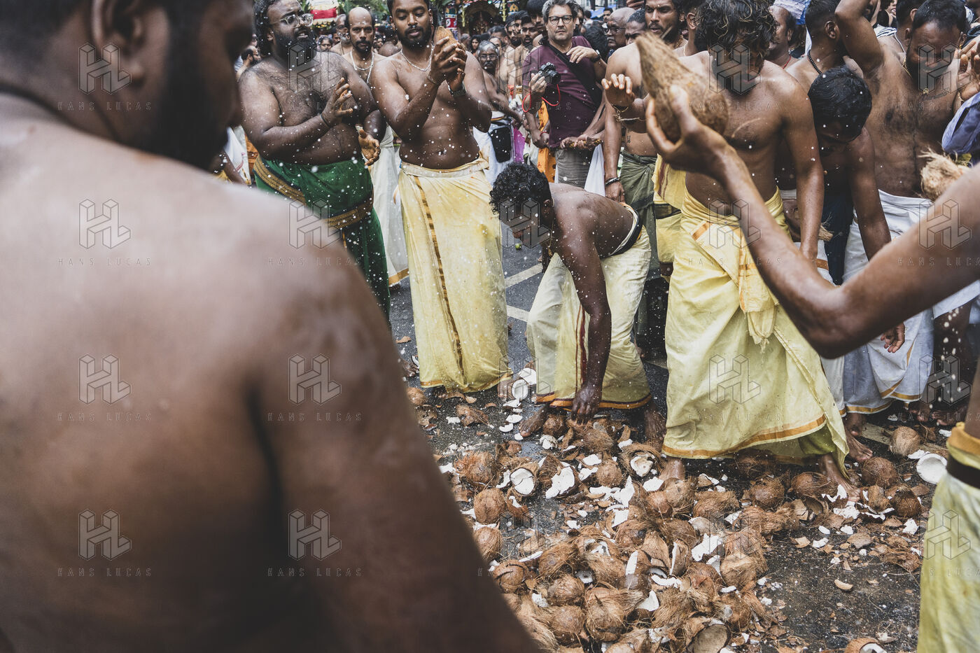 It is around the Sri Manicka Vinayakar Alayam temple located in the 18th arrondissement of Paris, that Ganesh is celebrated every year in the capital. During this day of celebration, religious ceremonies and a procession take place in the streets of the neighborhood. During this religious parade, coconuts are broken: the shell represents the illusion of the world, the flesh represents individual karma, and the coconut water represents the ego. This water is poured as the representation of Ganesha passes by. Next come the dancers, who carry large peacock feather arches called kavadi on their shoulders, and the female dancers, who carry terracotta pots with burning camphor on their heads.