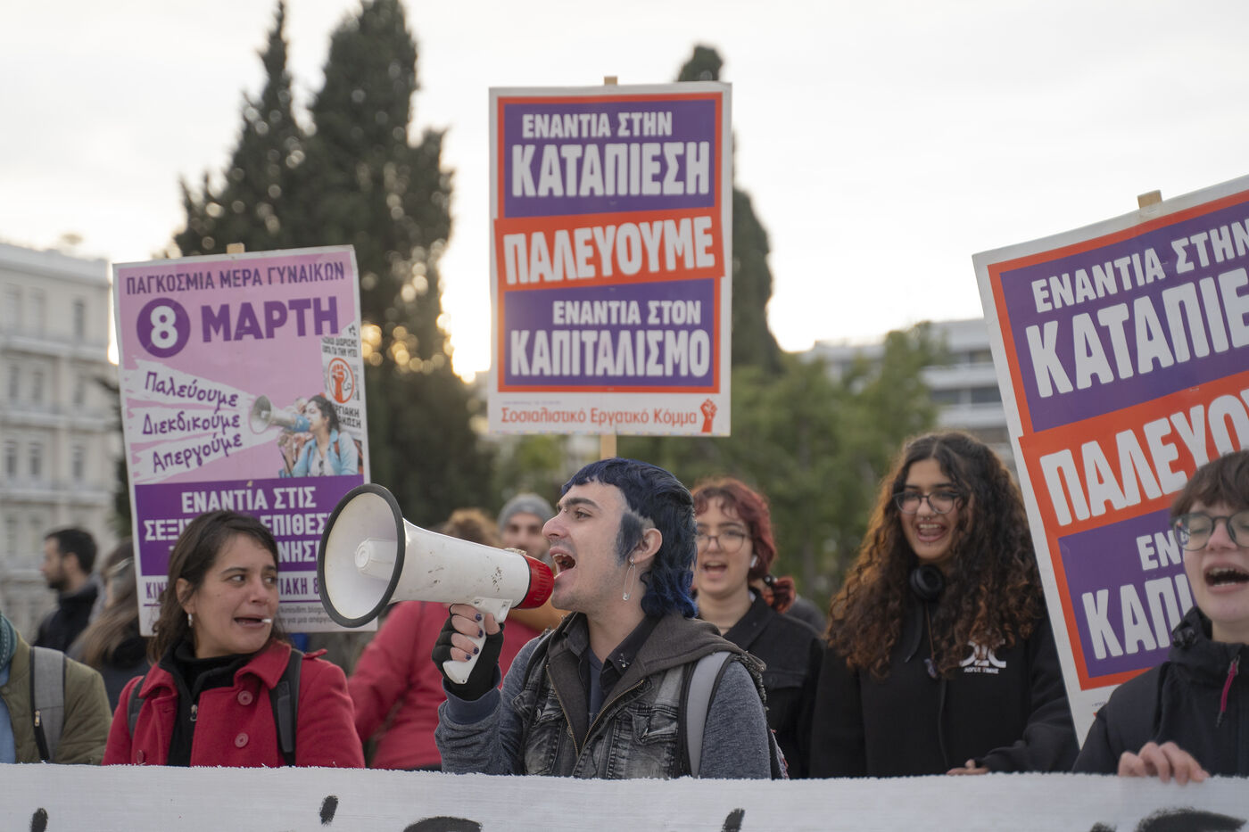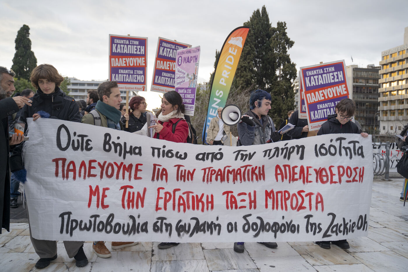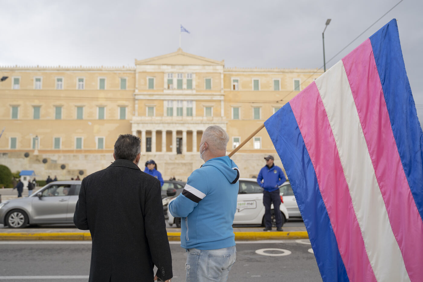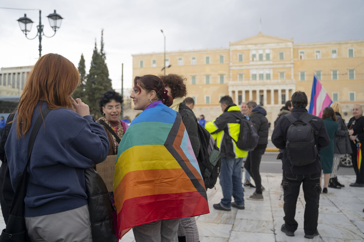 Demonstrators gathered in front of the Parliament in Athens where the law for the marriage of couples of the same sex was being debated at the same time.