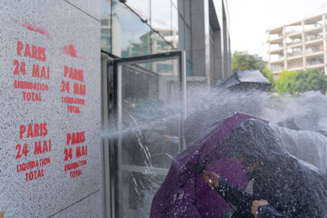 Action d'Extinction Rebellion devant le siège d'Amundi pendant la 100eme assemblée générale des actionnaires de Total.