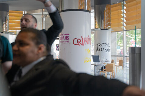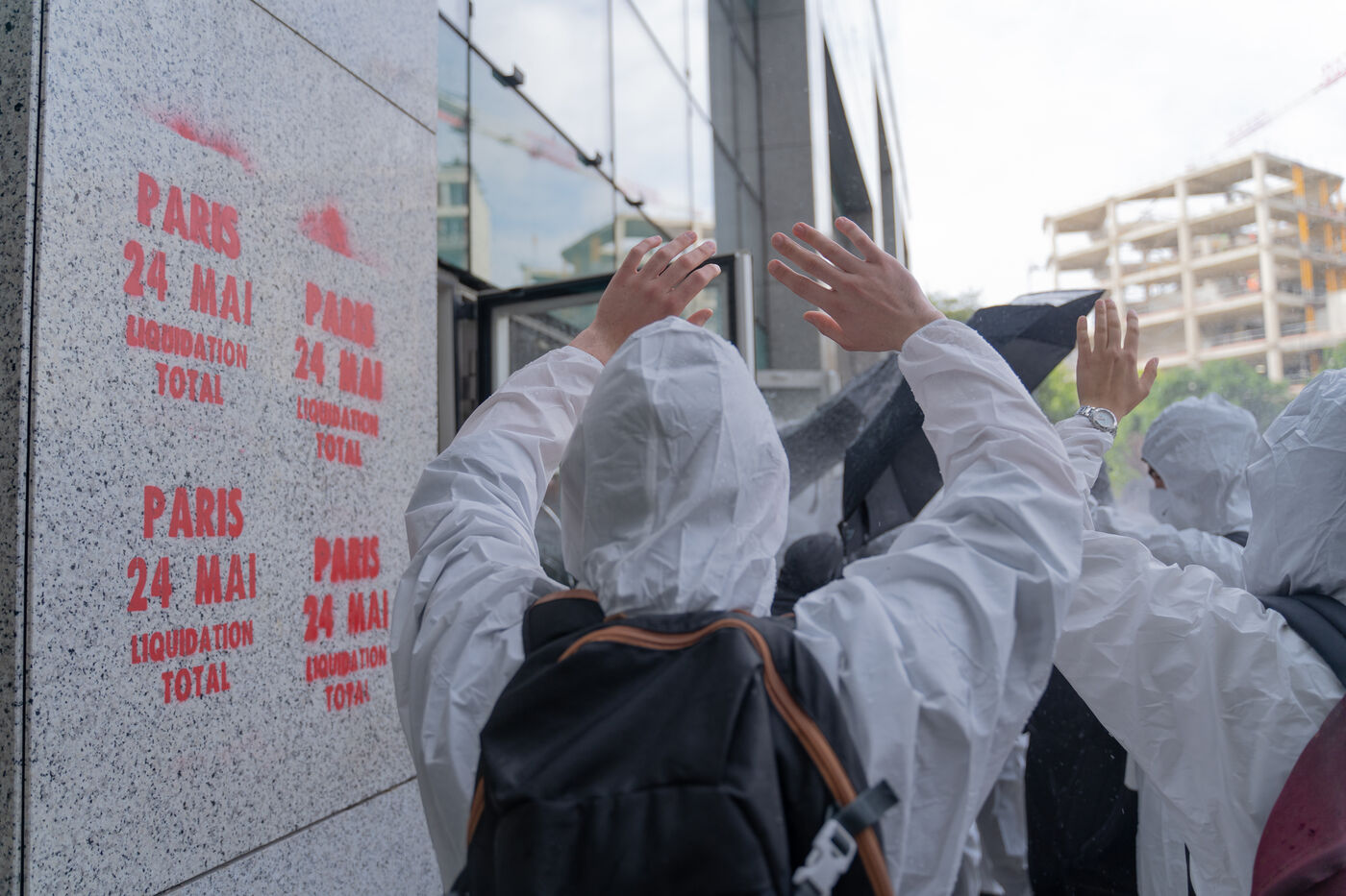 Extinction Rebellion action in front of Amundi headquarters during the 100th general meeting of shareholders of Total.