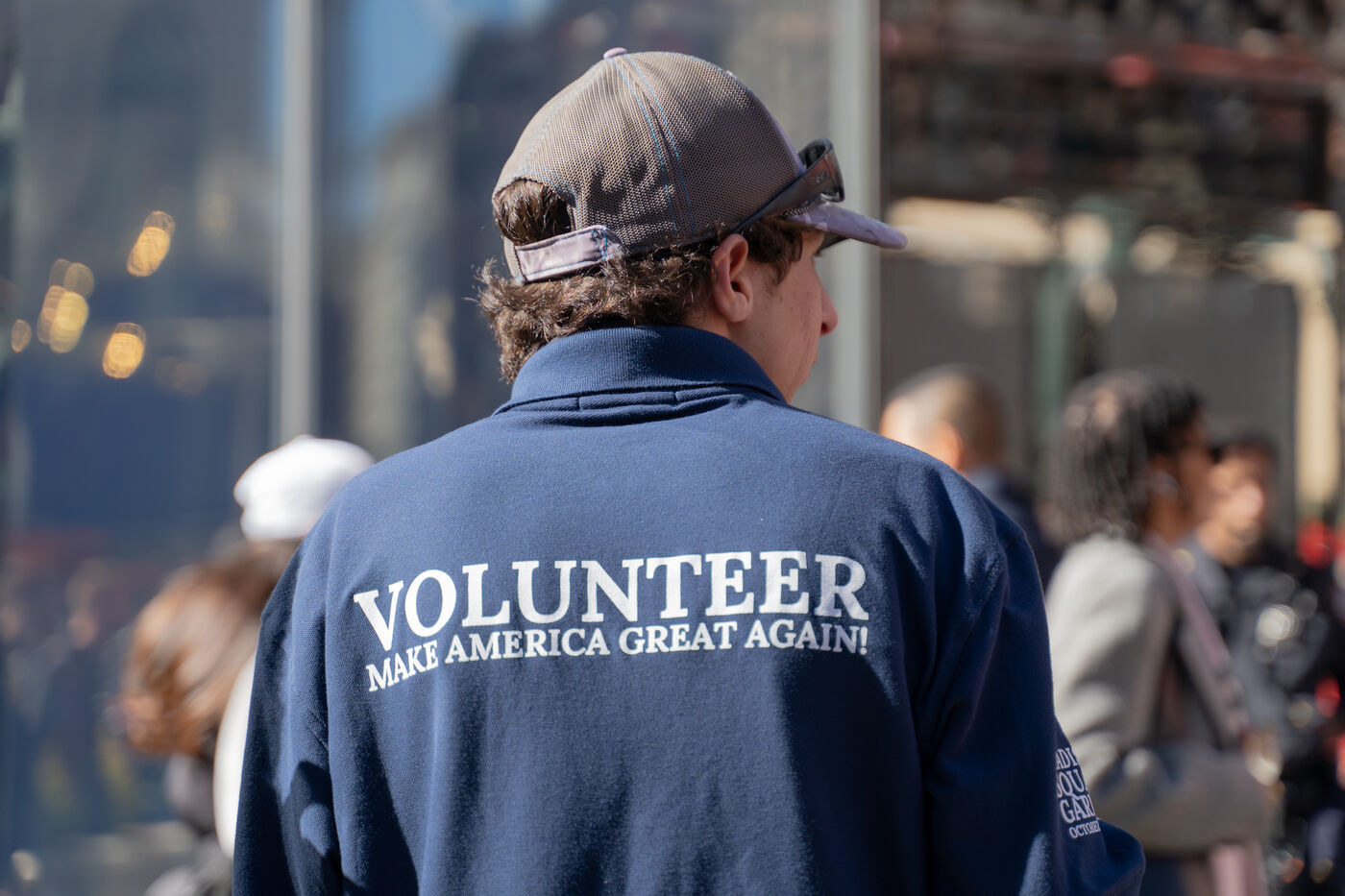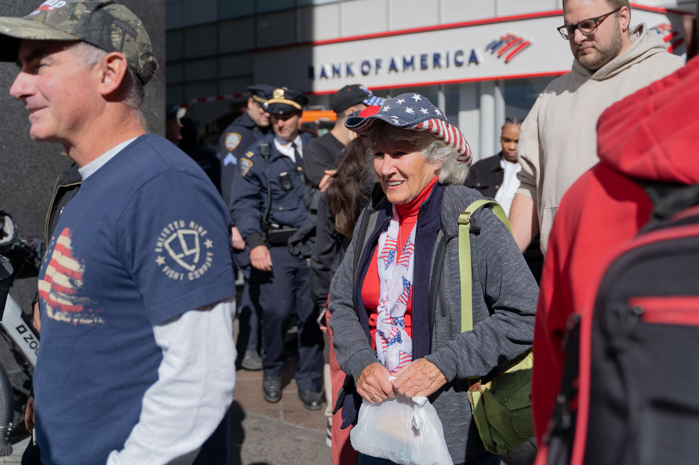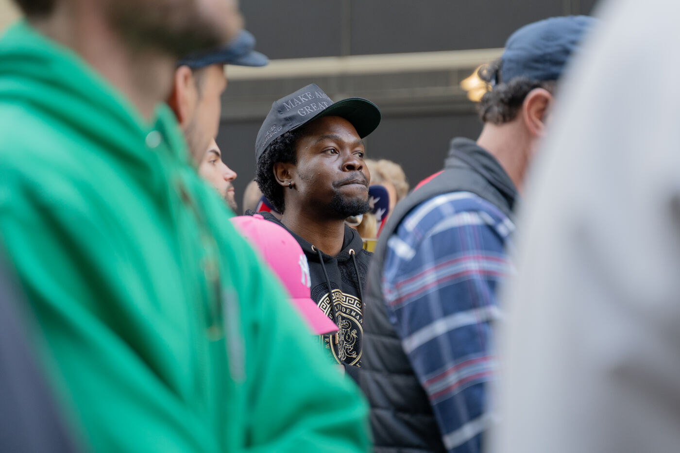 Meeting de Trump à New York City au Madison Square Garden, des milliers de supporters sont venus l'écouter et certains n'ayant pas pu avoir de place sont rester à l'extérieur pour promouvoir le candidat, répondre aux interviews de la presse et écouter son discours sur les écrans géants aux alentours de la salle.